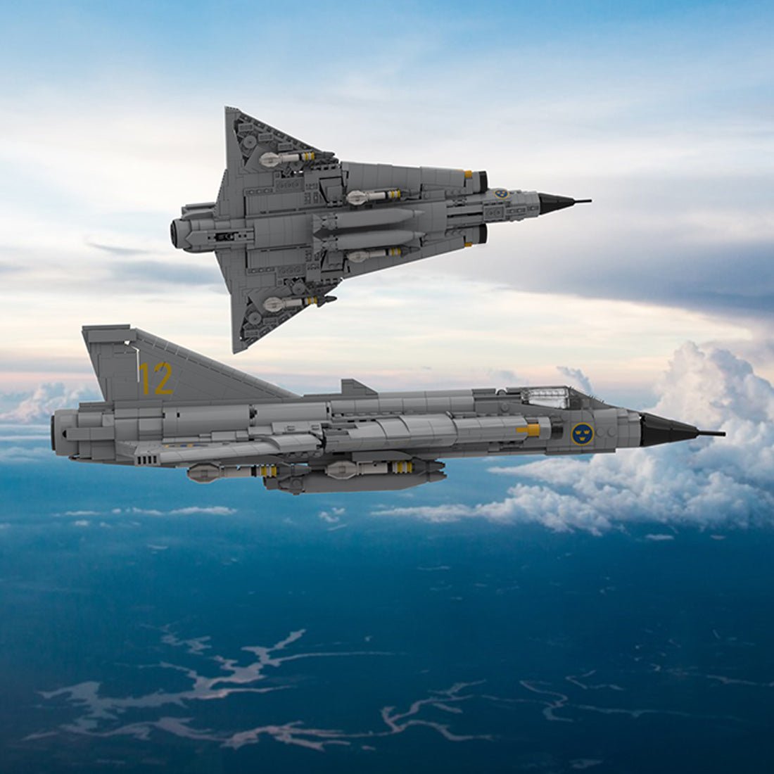 Entworfen und autorisiert von brickships.ch. Die J35D ist ein Kampfflugzeug der zweiten Generation, das zwischen 1955 und 1974 von einem schwedischen Unternehmen hergestellt wurde. Bekannt für seine Doppeldeltaflügelkonstruktion, war es das erste westeuropäische Kampfflugzeug, das die Schallmauer durchbrach. Die J35D wurde hauptsächlich vom schwedischen Militär eingesetzt, aber auch nach Dänemark, Finnland und Österreich exportiert.