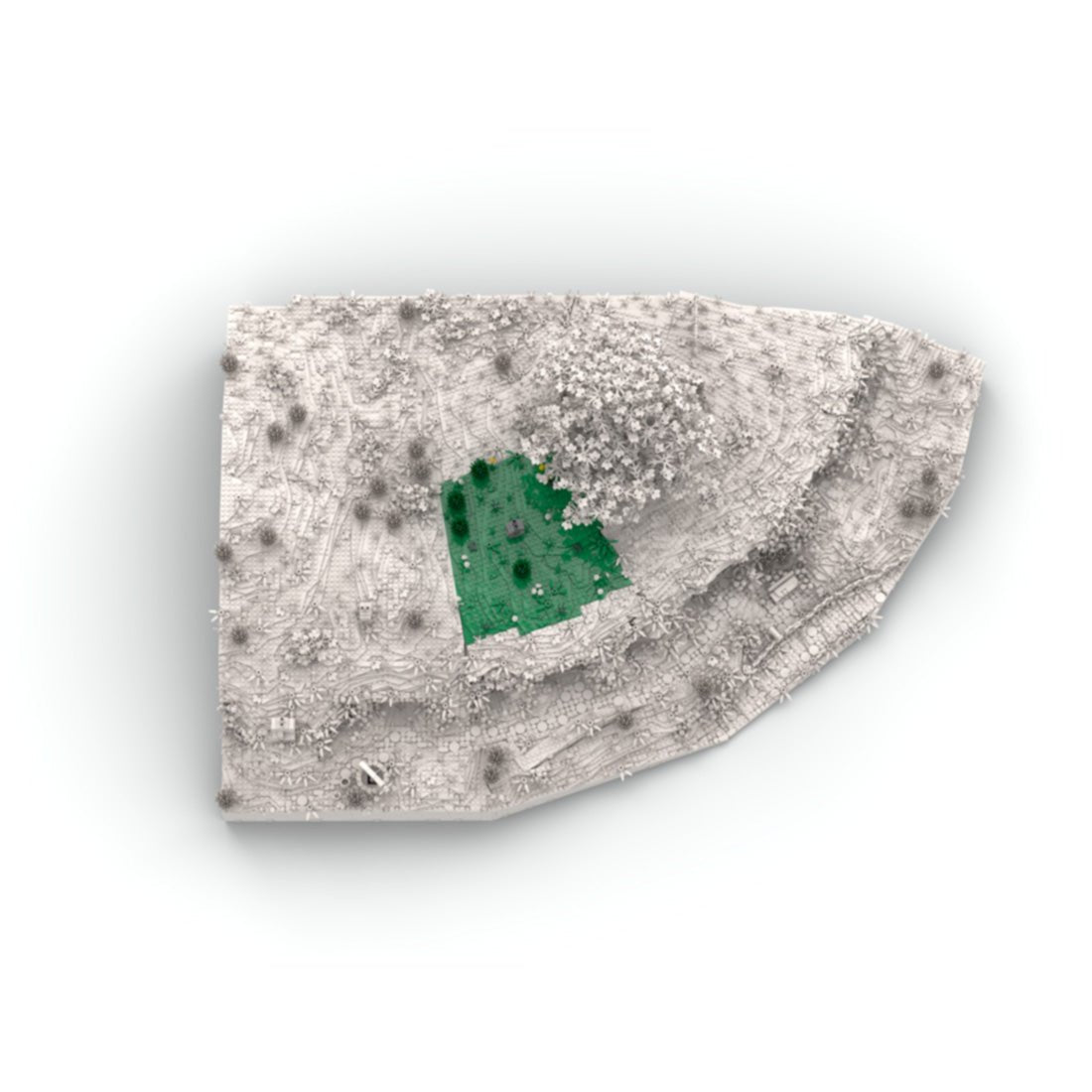 Das 16. und letzte Modul der Bauphase 4 vervollständigt das Wohnzimmer und den Flur im Obergeschoss. Der Bereich um die alte Eiche rechts ist integriert und fällt nach links steil ab. Die Linien des großen Fensters werden nach hinten verlängert. Zahlreiche Pflanzen und Grünflächen verleihen dem Modul ein natürliches Aussehen.