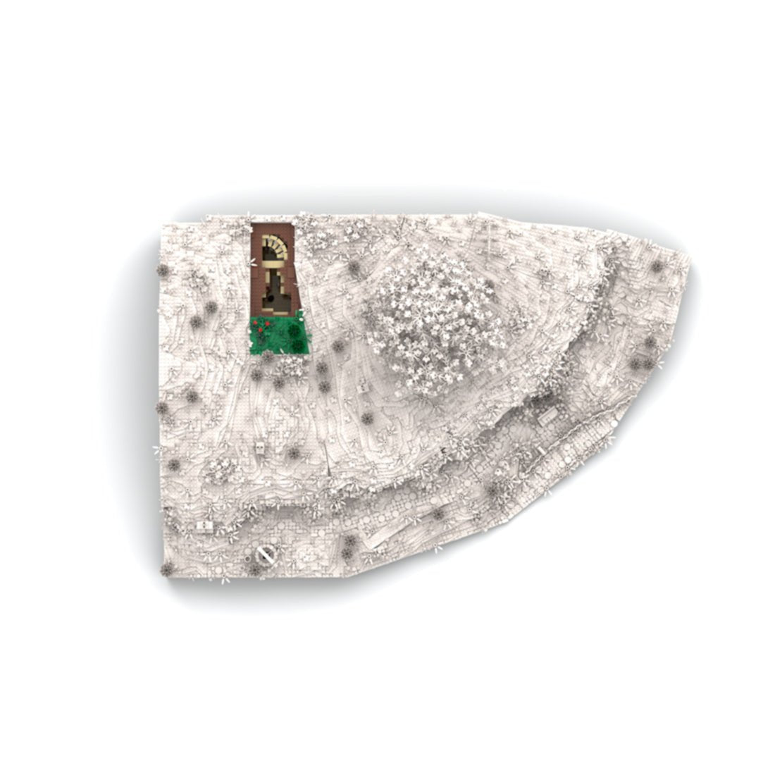 Die Wiese oberhalb des Verbindungsgangs ist mit ihren wenigen Elementen eines der kleinsten Module, da das Gelände hier an der Rückseite auch einen seiner niedrigsten Punkte aufweist. Einige Platten und etwas Grünzeug sind auf einem stabilen Rahmen platziert, um das Gelände zu erweitern und einen Übergang zu den anderen Modulen zu schaffen.