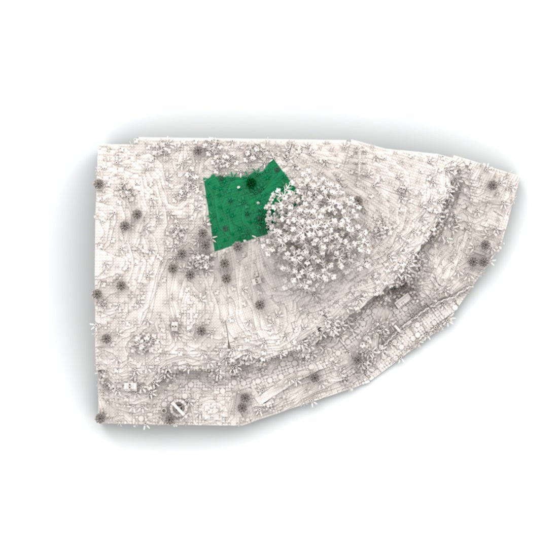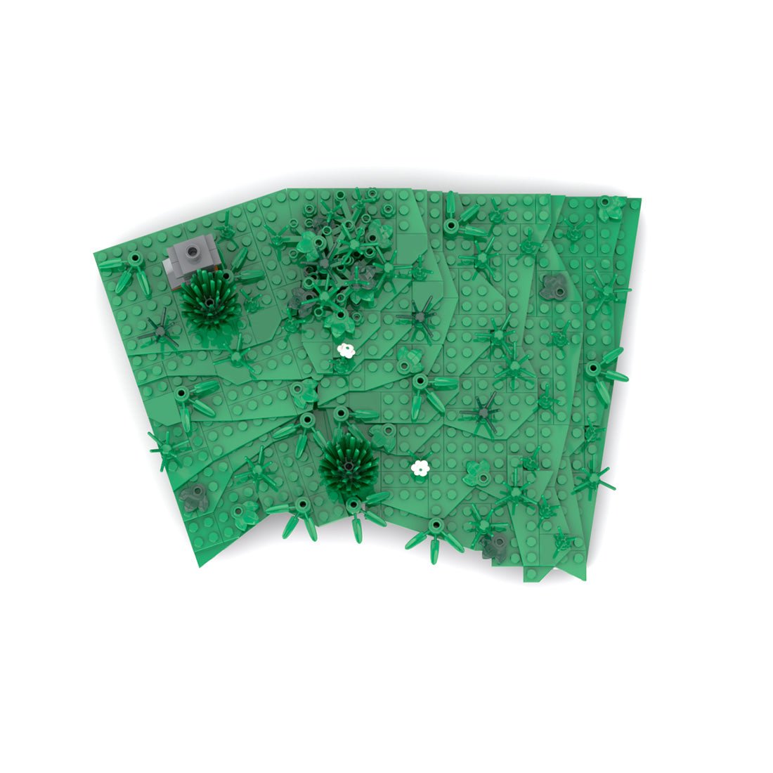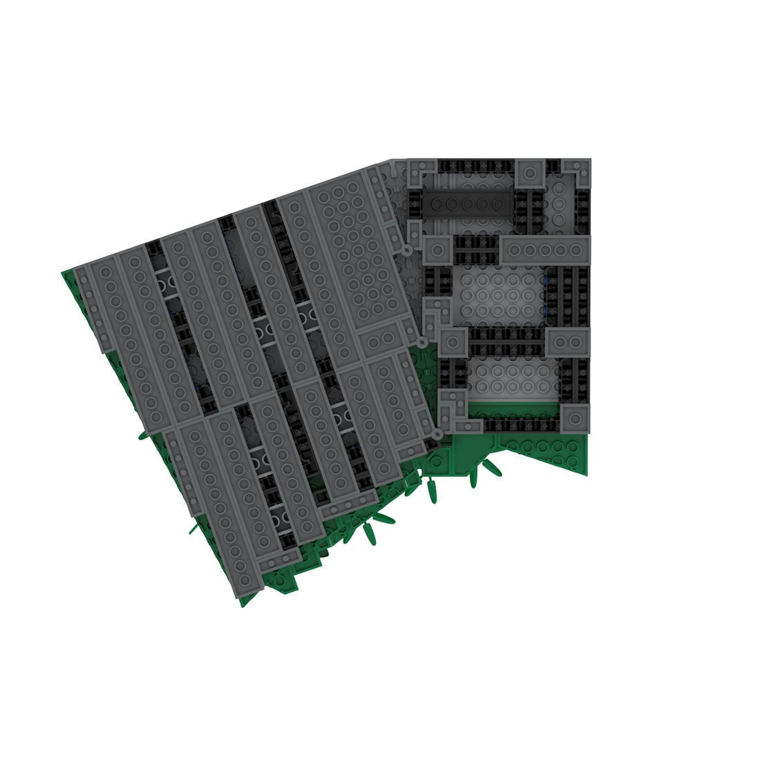 Die Wiese über dem Raucherzimmer ruht auf demselben Rahmen. Mehrere Scharniere gewährleisten maximale Stabilität an den Winkeln. Die zahlreichen Winkel und Übergänge der Keilplatten erschwerten eine glatte Oberfläche und einen nahtlosen Übergang zu den anderen Modulen. Durch die Verwendung verschiedener Pflanzen konnten die kleineren Lücken jedoch geschlossen werden, sodass sich das Modul optisch harmonisch in die anderen Wiesenmodule einfügt.