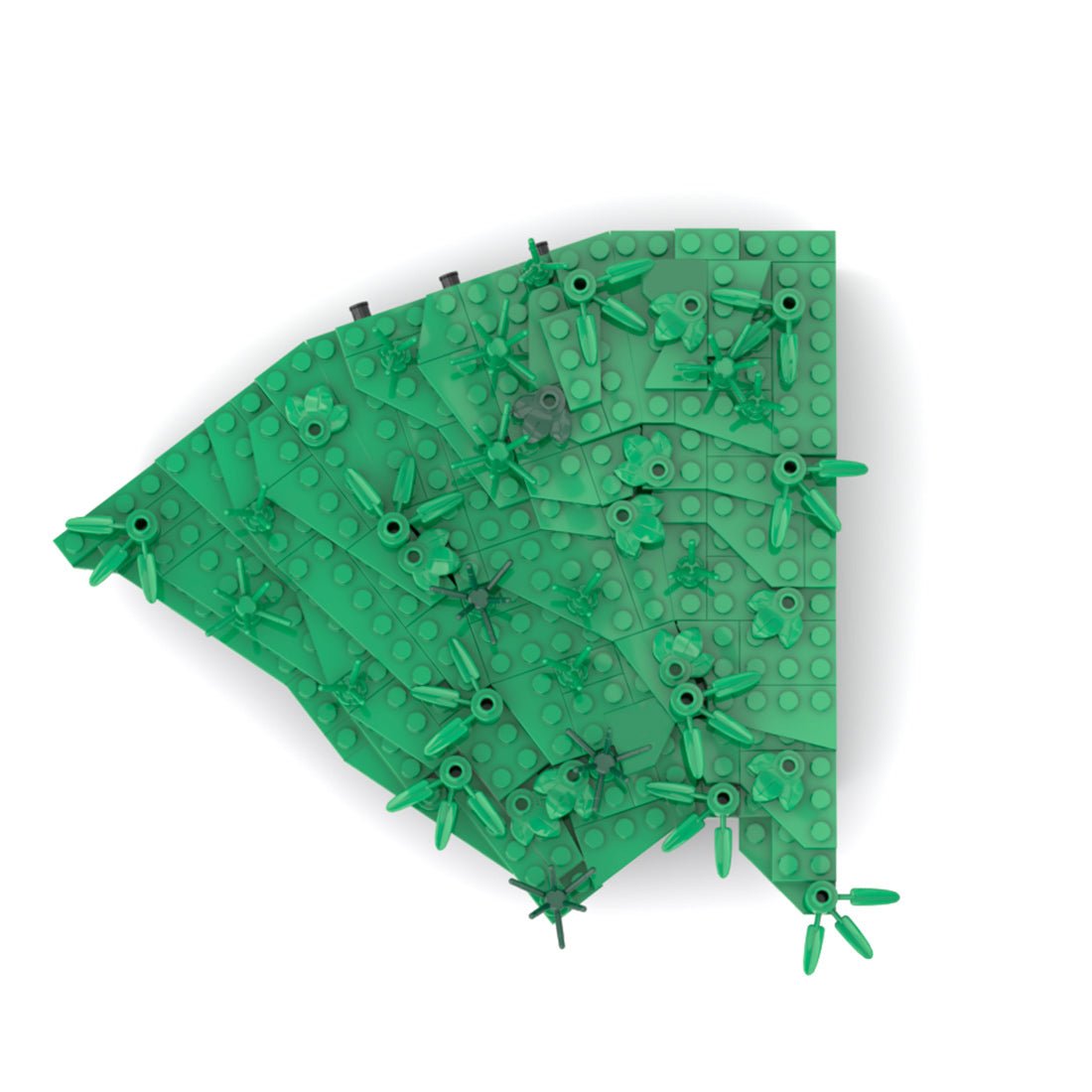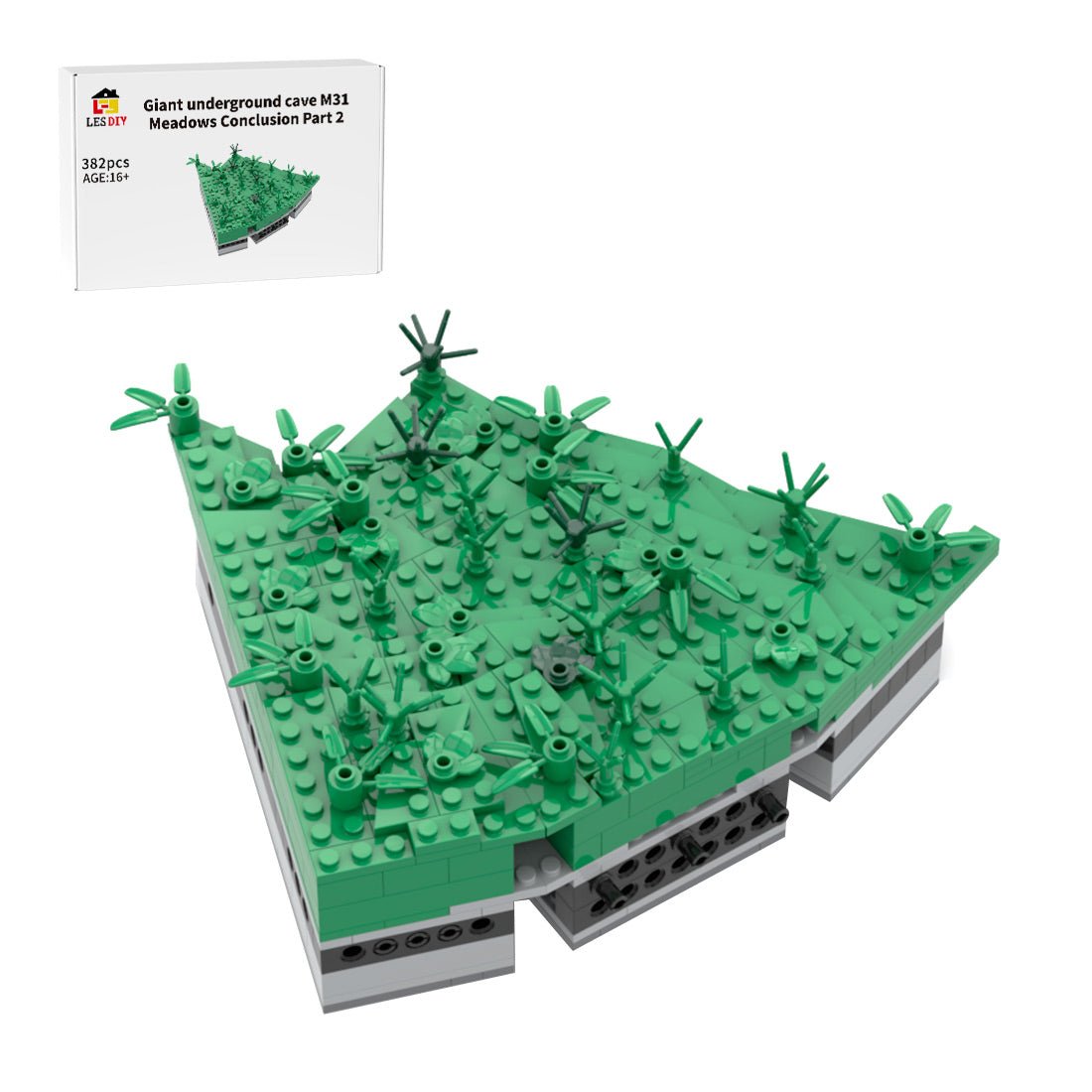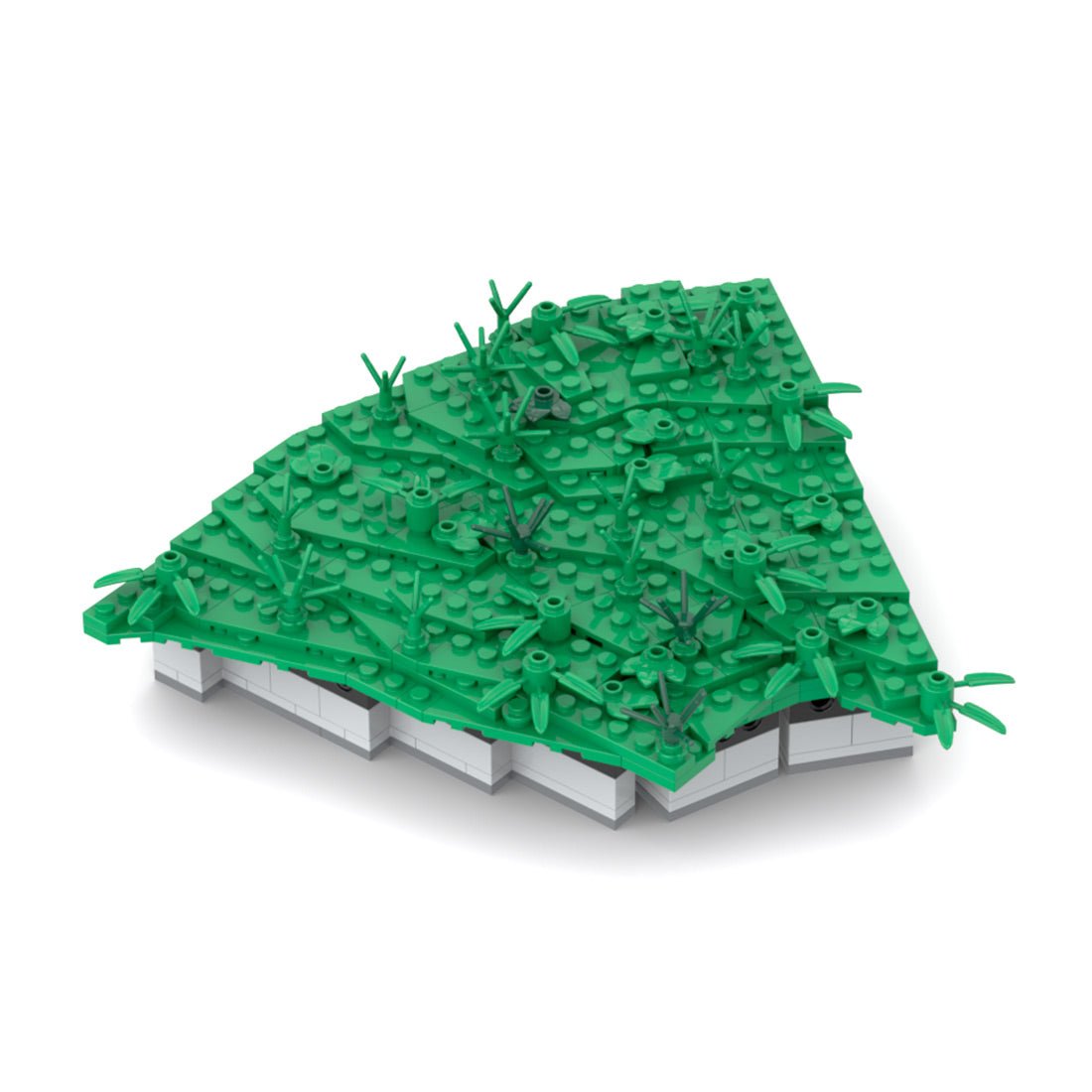 Das zweite, kleinere Endmodul besteht aus drei verschiedenen Winkeln und wird durch Scharniersteine zusammengehalten. Da dieses Modul durch Stifte und Kontaktflächen an anderen Modulen fixiert wird, war eine zusätzliche Unterkonstruktion über die Basis hinaus nicht erforderlich. Platten und Keilplatten schließen die Wiese auf kleinstem Raum ab und erwecken so den Eindruck, als sei das Gelände vollständig um die große Eiche herum geschlossen. Das Modul wird in der zweiten Bauphase eingesetzt und durch die Stifte fixiert.