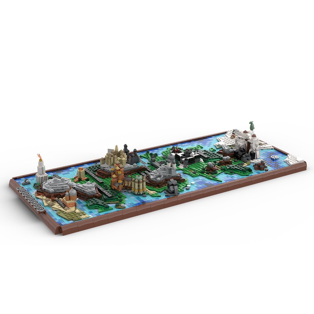 Dieses Bausteinkartenset präsentiert die Sieben Königslande und ihre wichtigsten Orte. Die vollständige Karte umfasst Berge, Meere, Burgen, Wälder und ikonische Bauwerke wie die Mauer im Norden und bildet so eine detailreiche Landschaft.