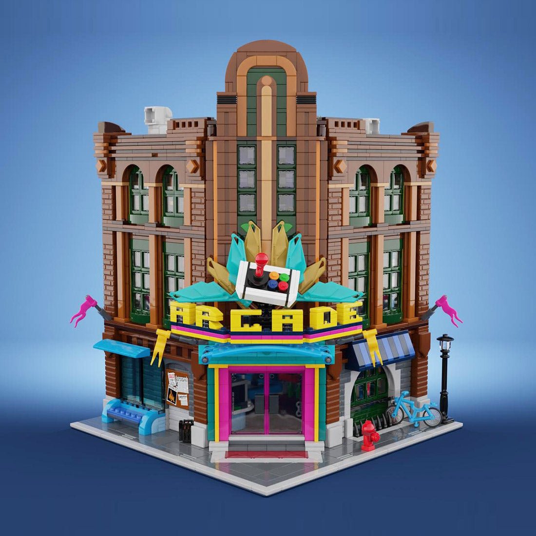 Erwecken Sie die Spannung der 80er Jahre mit diesem modularen Design einer klassischen Videospielhalle zum Leben. Das Gebäude besticht durch eine Mischung aus moderner und älterer Architektur, mit einer originalen Backsteinfassade, einem Vordach und einer Bushaltestelle am Bordstein. Erleben Sie den Nervenkitzel der Spielhalle mit detailreichen Details, darunter eine farbenfrohe Dekoration über dem Eingang und ein riesiger Videospiel-Joystick.