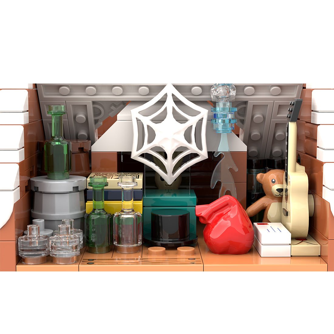 Stellen Sie sich zwei einfache Schreibtische vor. In der Ecke steht ein stabiler Safe, während sich auf einem kleinen Tisch Hauptbücher und staubige Bücher stapeln. Wenn Sie genau hinschauen, finden Sie sogar einen Kalender. Versteckte Fächer unter dem Boden sind wirklich einzigartig gestaltet und beherbergen einen Vorrat an Scheinen und Münzen. Im ersten Stock erwartet Sie ein privates Schlafzimmer. Ein einfacher Waschtisch und eine hoch aufragende Standuhr markieren den Eingang, während ein paar Stufen zum Hauptschlafzimmer führen. Darin befinden sich ein einfaches Einzelbett, ein schlichter Nachttisch und ein einzelner Sessel. Über dem Kamin erinnert eine holländische Fliese an die Beschreibung eines Kamins im Buch. Der Dachboden, oft ein Ort, an dem vergessene Gegenstände gefunden werden, birgt viele Überraschungen. Die Kisten dort sind mit verschiedenen Gegenständen gefüllt, von einer kaputten Gitarre bis hin zu einer Sammlung weggeworfener Kinderspielzeuge, und jeder Gegenstand erzählt eine stille Geschichte.