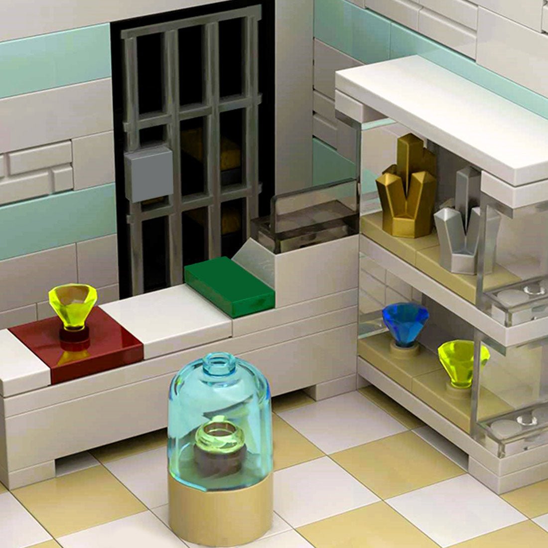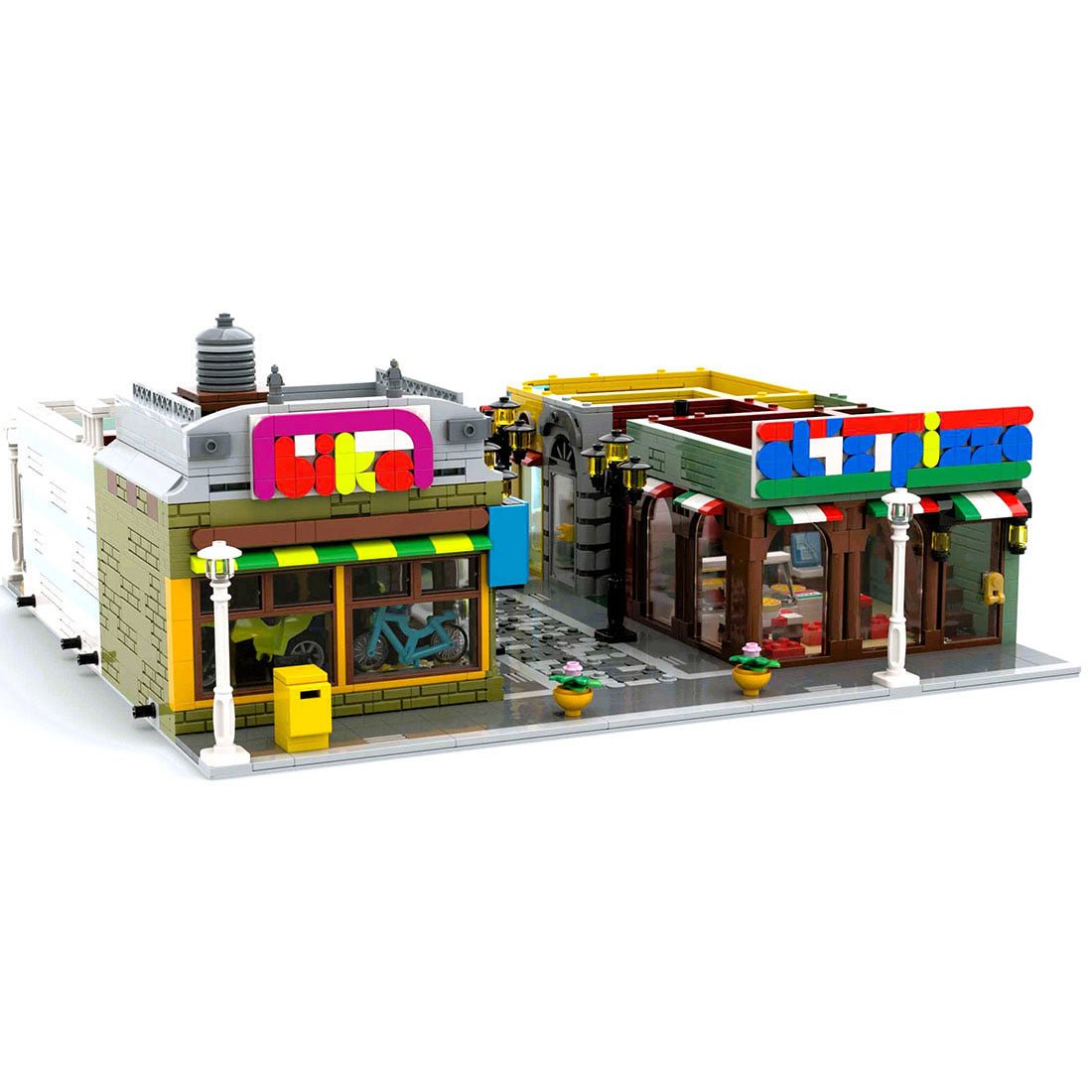 Dieses von Albox82 entworfene und autorisierte modulare Blockmodell der Altstadt umfasst vier einzigartige Geschäfte entlang einer detailreichen Kopfsteinpflasterstraße: einen Vintage-Zeitungskiosk, ein Juweliergeschäft mit höhlenartigem Interieur und vier Ausstellungsregalen, ein Blockgeschäft mit charakteristischen Backsteinwänden und abwechslungsreichen Regalen, ein Fahrradgeschäft und eine Pizzeria mit internem Badezimmer, Sitzgelegenheiten auf der Dachterrasse, Mini-Apartments und einem reizvollen Vordach für Grillabende und Blumen.