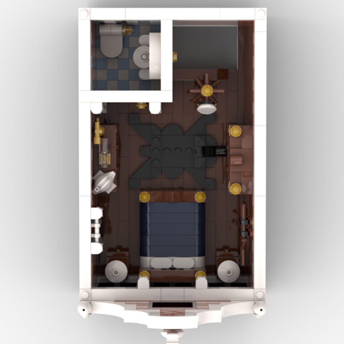 Level 2: Above the store is a cozy apartment inhabited by an adventurer or explorer. This level is classically furnished, featuring a bathroom with a bathtub and an open kitchen. The apartment contains various artifacts, including minerals, a magic lamp, and fossils. A spiral staircase connects this level to the third floor.