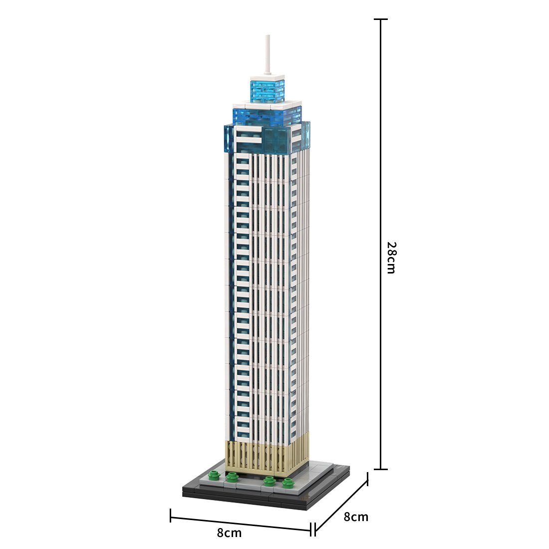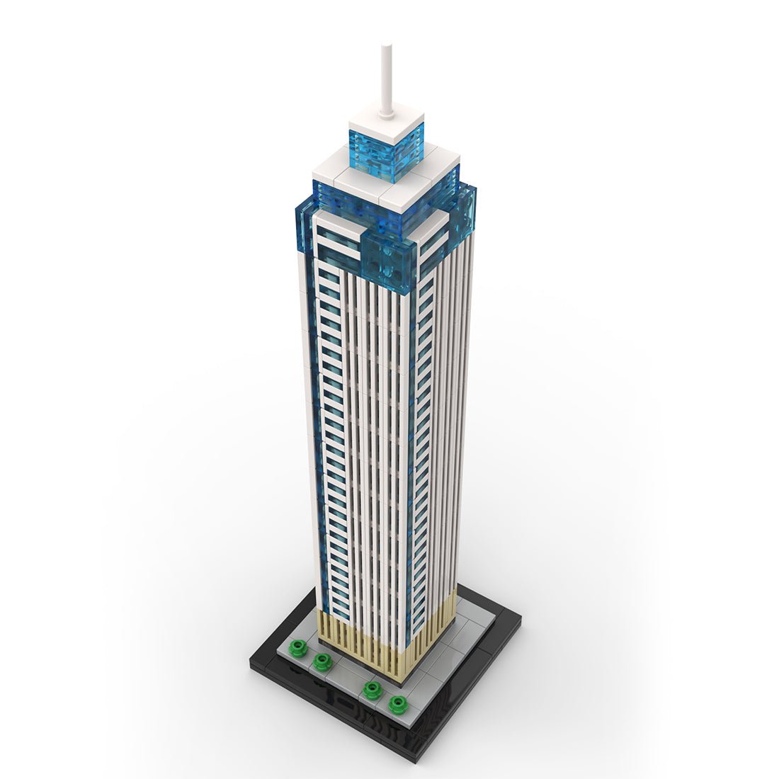 Diese detailgetreue Nachbildung eines berühmten Wolkenkratzers basiert auf einem Bausteinmodell. Seine hohe, schlanke Silhouette besticht durch eine klare Farbpalette aus weißen, grauen und blauen Ziegeln. Versetzt angeordnete, transparente blaue Elemente simulieren die Glasfassade und erzeugen so den luftigen, modernen Look des Originals. Der goldfarbene Sockel greift die metallische Oberfläche des Fundaments auf, und der blaue Farbverlauf mit der schlanken Antenne bildet die ikonische Skyline des Wahrzeichens präzise nach. Das Modell wird mit einem minimalistischen schwarzen Sockel geliefert, der mit grünen Elementen die umgebende Vegetation symbolisiert und so einen Hauch von urbanem Flair verleiht.