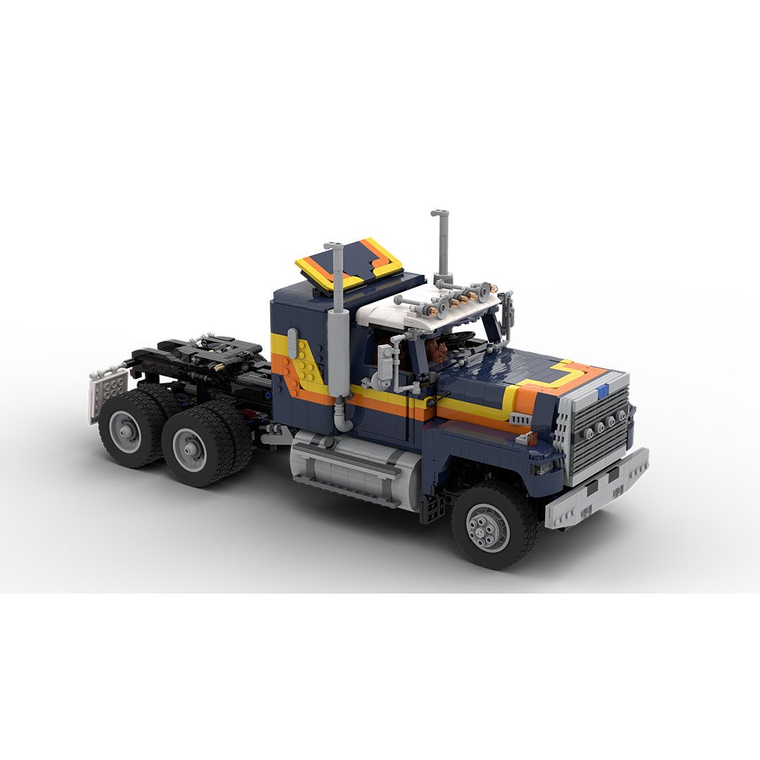 Entworfen und lizenziert von Mani91, inspiriert von einem speziellen traditionellen Truck der Klasse 8. Das Design erinnert an einen amerikanischen Retro-Truck aus einem Spiel und verfügt über ein spezielles Antriebskonzept: Der Offroad-Motor treibt ein Zweiganggetriebe an und verteilt die Kraft auf alle Räder (6x6). Die Kraft wird ausschließlich über Planetennaben an die Räder übertragen, wodurch die Antriebswellen entlastet werden. Die Vorderachse verfügt über eine Antriebswelle und die Hinterachse über zwei (!) Kardanwellen – jede Achse hat ihre eigene Antriebswelle – für eine perfekte Kraftverteilung. ➠ Vollständig funkgesteuert