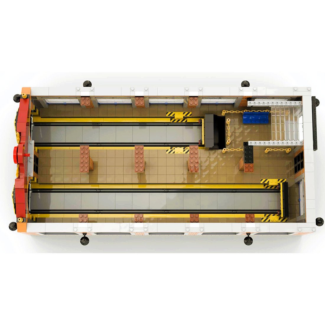 Das Railway Steam Train Museum in Brick Town, einer ehemaligen Eisenbahnfabrik, ist jetzt bereit, Ihre historischen Dampfmaschinen auszustellen. Besucher können Ihre Züge besichtigen (bringen Sie sie also mit!). Das Museum verfügt über zwei Gleise im Abstand von 8 Stützpunkten, die sich nahtlos in das Eisenbahnsystem Ihrer Stadt einfügen, sowie über große schwarz-gelbe Türen für einfachen Zugang. Draußen gibt es eine Wasserstation (mit Dreharm) und einen alten Tender. Eine Anspielung auf die Dampfära. Das MOC lässt sich in zwei Hauptteile aufteilen, die miteinander verbunden werden; der Dachabschnitt kann für einfachen Zugang zum Inneren abgenommen werden. Ein elegantes Logo der Railway Company mit einem Eisenbahnrad und Flügeln ziert die Vorderseite des Gebäudes.