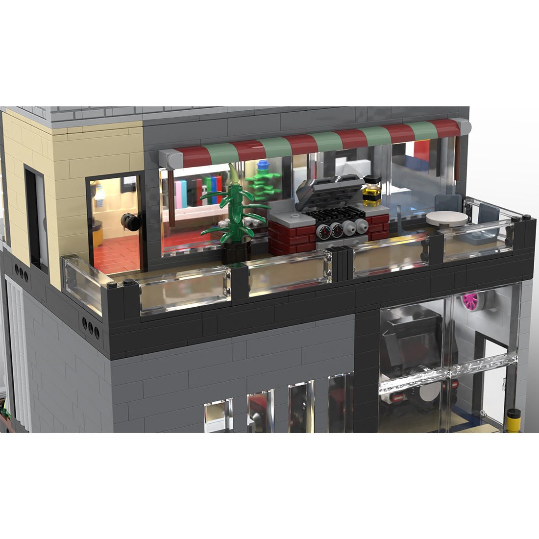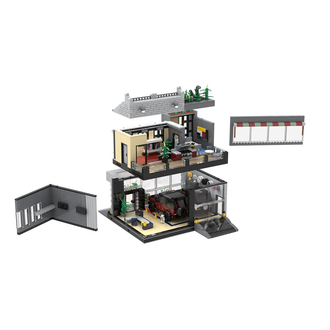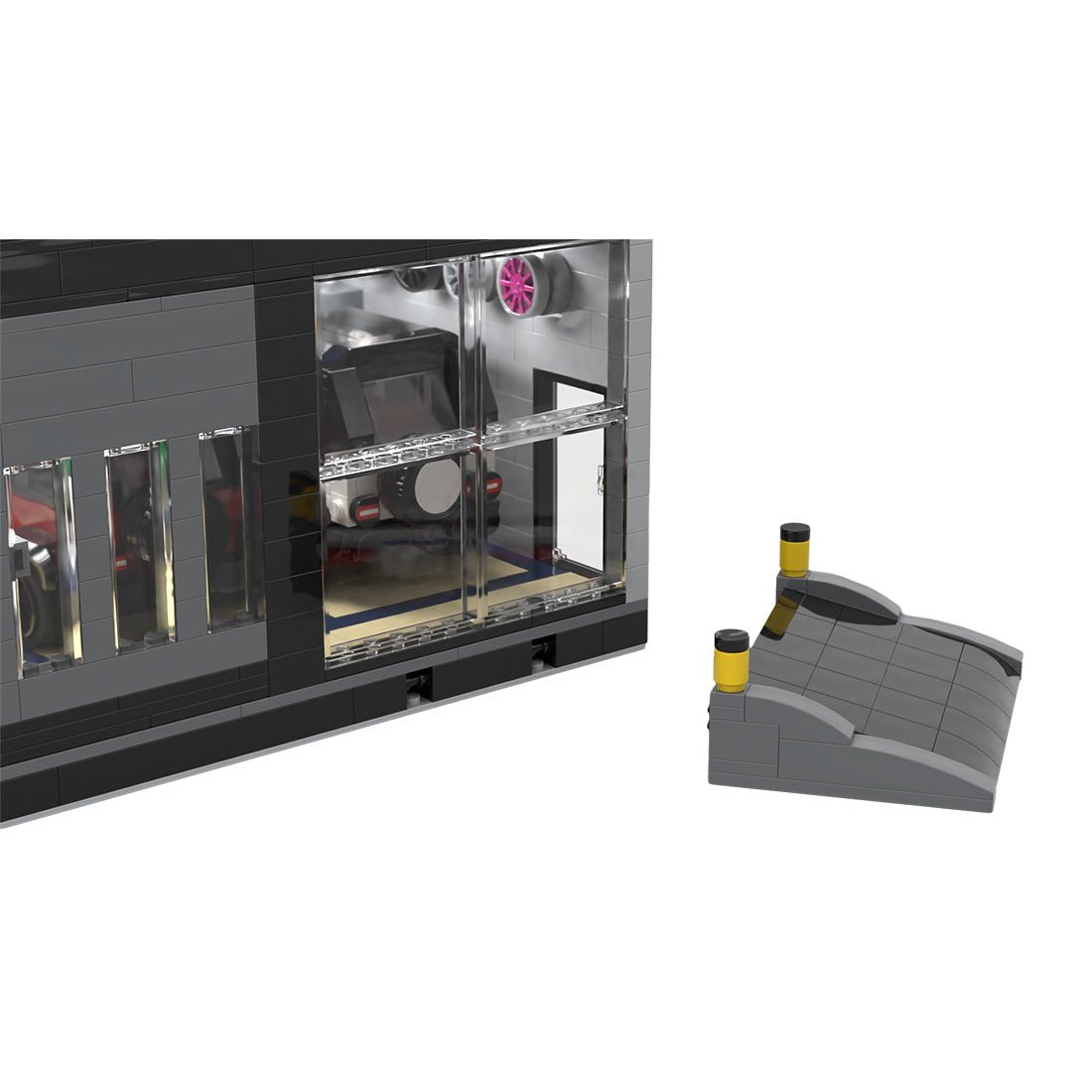 - This modular building features a solid structure and very good scene details. It is divided into two floors, the first floor is the car hall and the sales office. Two luxurious cars are displayed in the exhibition hall. The garage door can be removed. The vehicles enter and exit the exhibition hall via the ramp in front of the door.