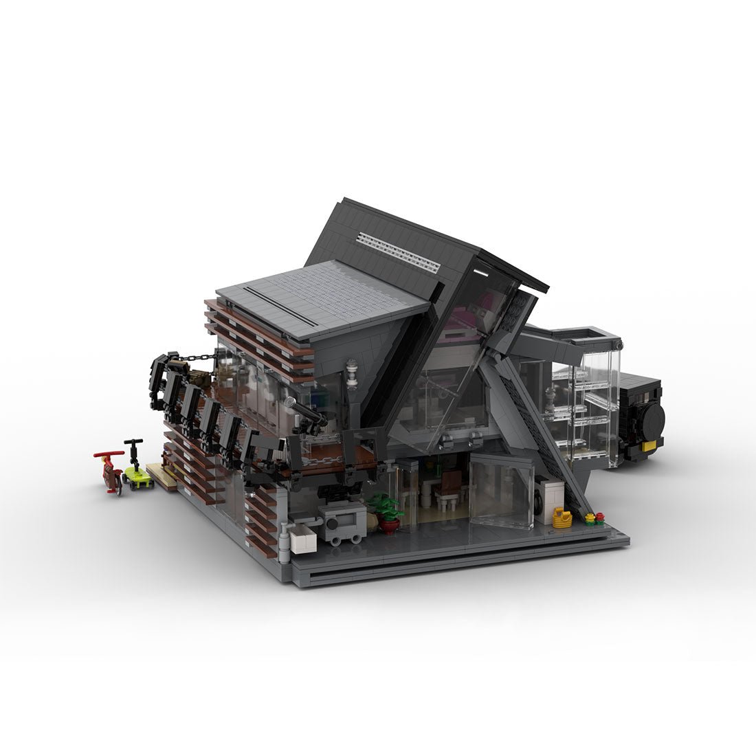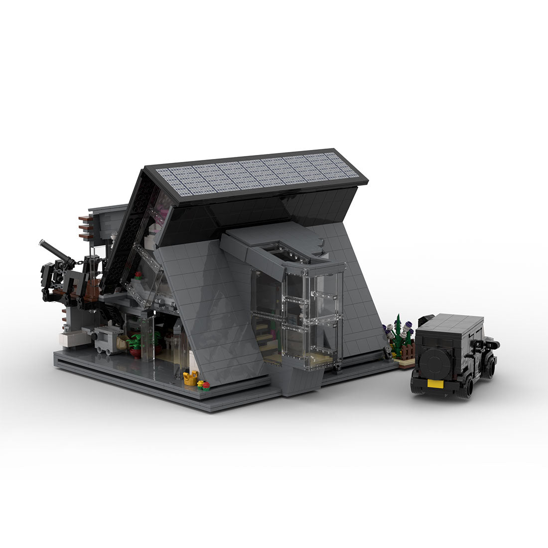 Dies ist ein modernes Bausteinmodell einer Dschungelvilla mit einem Dach in Form des griechischen Buchstabens „λ“ und einem polygonalen Erscheinungsbild. Das Dach ist mit zahlreichen Solarmodulen ausgestattet, die tagsüber etwas grüne Energie liefern. Vor der Villa gibt es einen kleinen Garten und einen Briefkasten. Das Haus ist drei Stockwerke hoch und verfügt im Erdgeschoss über eine offene, voll ausgestattete Küche. Der Essbereich und der Wohnbereich befinden sich in der Nähe. Neben der Eingangstür befindet sich ein Gästebad und auf der anderen Seite ein Abstellraum. Auf der Rückseite befinden sich ein Grillplatz und eine Waschmaschine. Die Treppe zum zweiten Stock ist von großen Glasscheiben umgeben, die von innen eine malerische Aussicht ermöglichen. Darüber hinaus sind die Betonwände mit verschiedenen Kunstwerken dekoriert.
