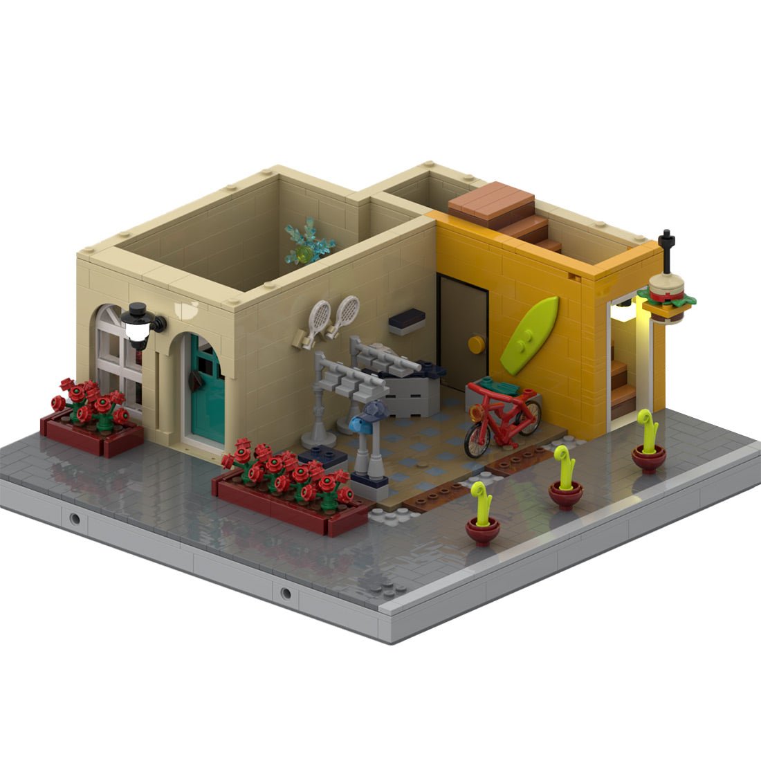 - It is a corner building on a 32*32 baseplate with connectors at a lower level to allow for connecting roads. It is easily converted into a truly modular, robust unit and will fit right into your city! On the ground floor there are two smaller shops: a sports shop and a magic crystal shop. To the right of the sports shop there is a staircase leading up to the hamburger restaurant which occupies the top two floors.