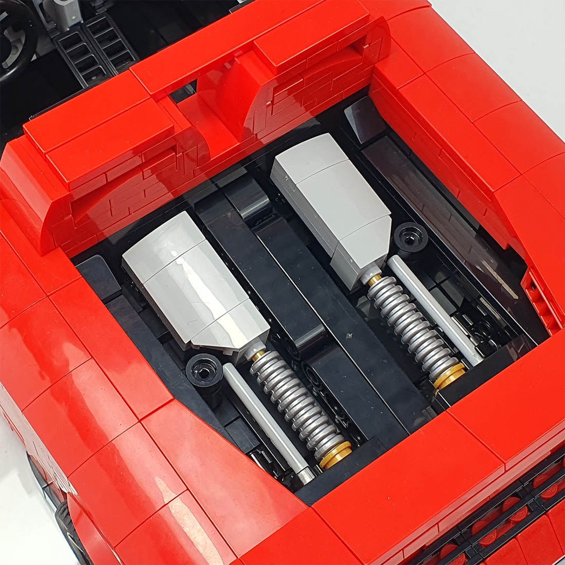 Aus Bausteinen zu einem modernen Sportwagenmodell zusammengebaut. Mit zu öffnenden Türen, abnehmbarer Heckhaube und Dach sowie detailreichem Innenraum. Mit leistungsstarkem Motor, Omelett-Scheinwerfern, seitlichen Lufteinlässen, schwarzem Shunt und silberner Zierleiste an der Seite.