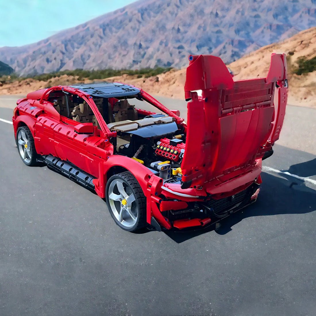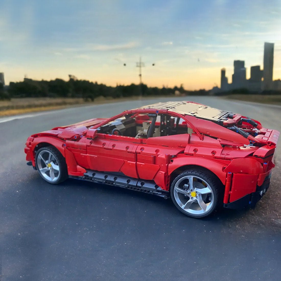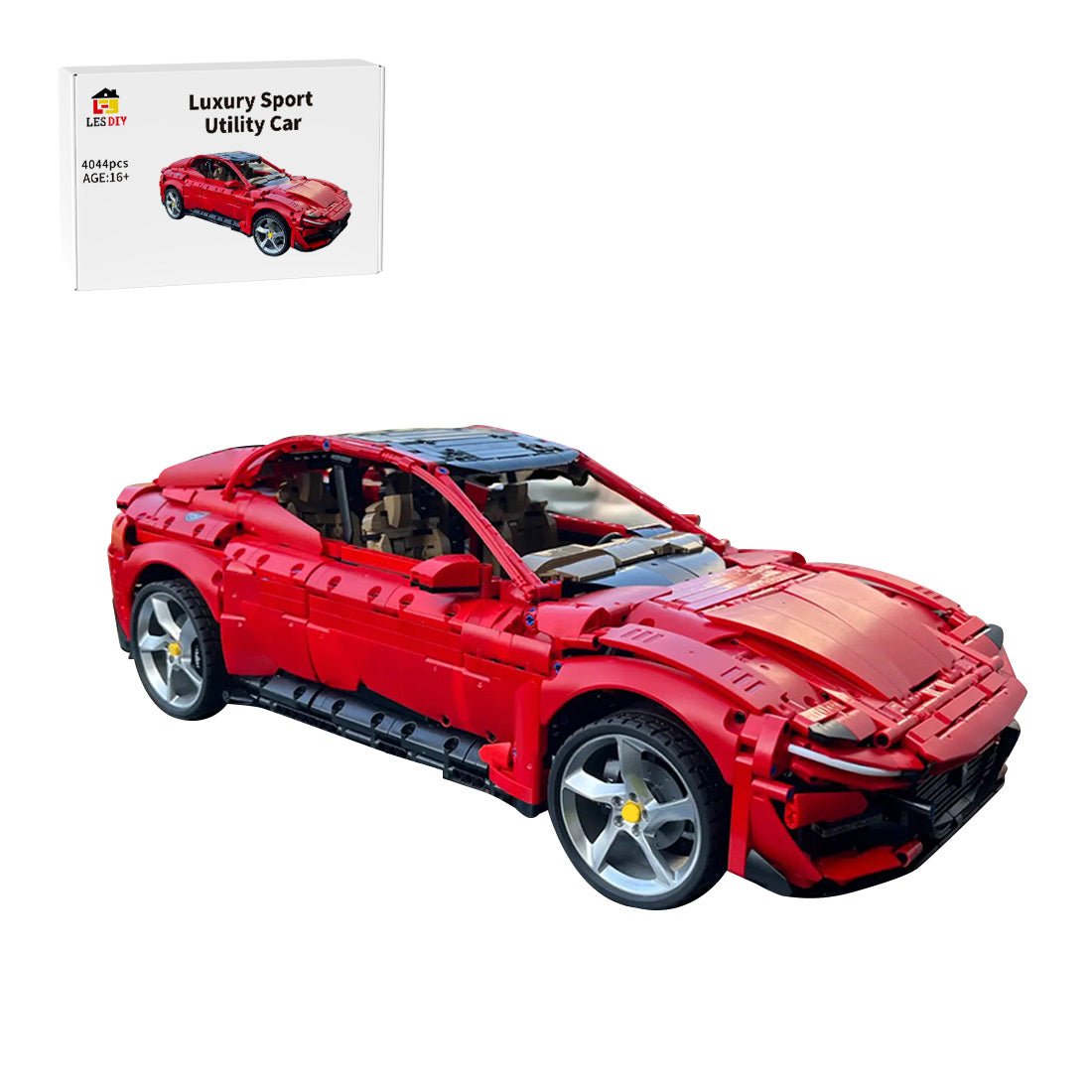 Entworfen und autorisiert von brictric. Dieses Bausteinauto ist einer bekannten Automarke nachempfunden und besticht durch sein leuchtendes Rot. Die schlanke und dynamische Karosserie spiegelt die Eleganz eines echten Sportwagens wider.