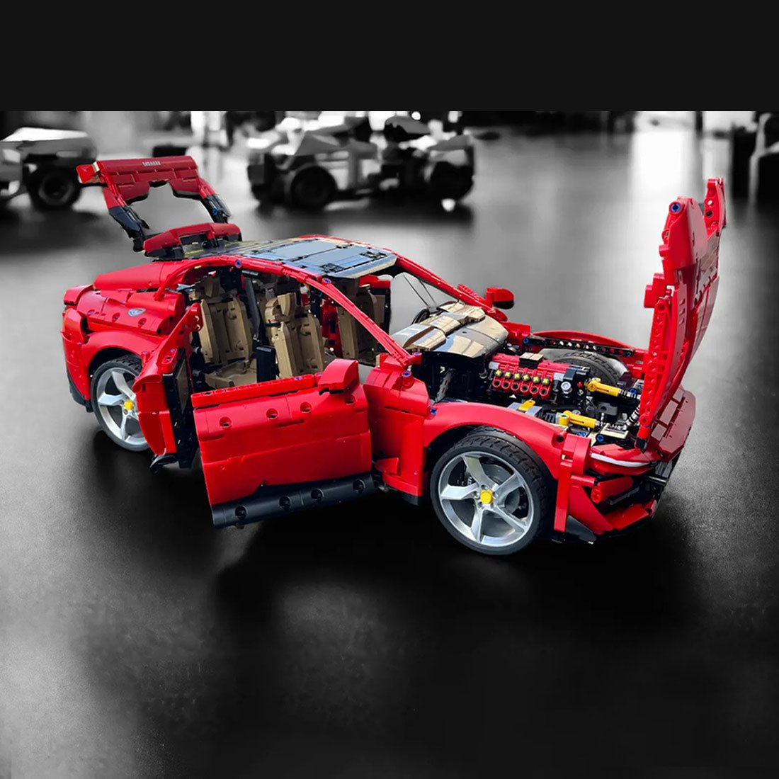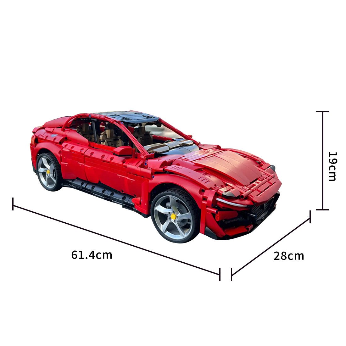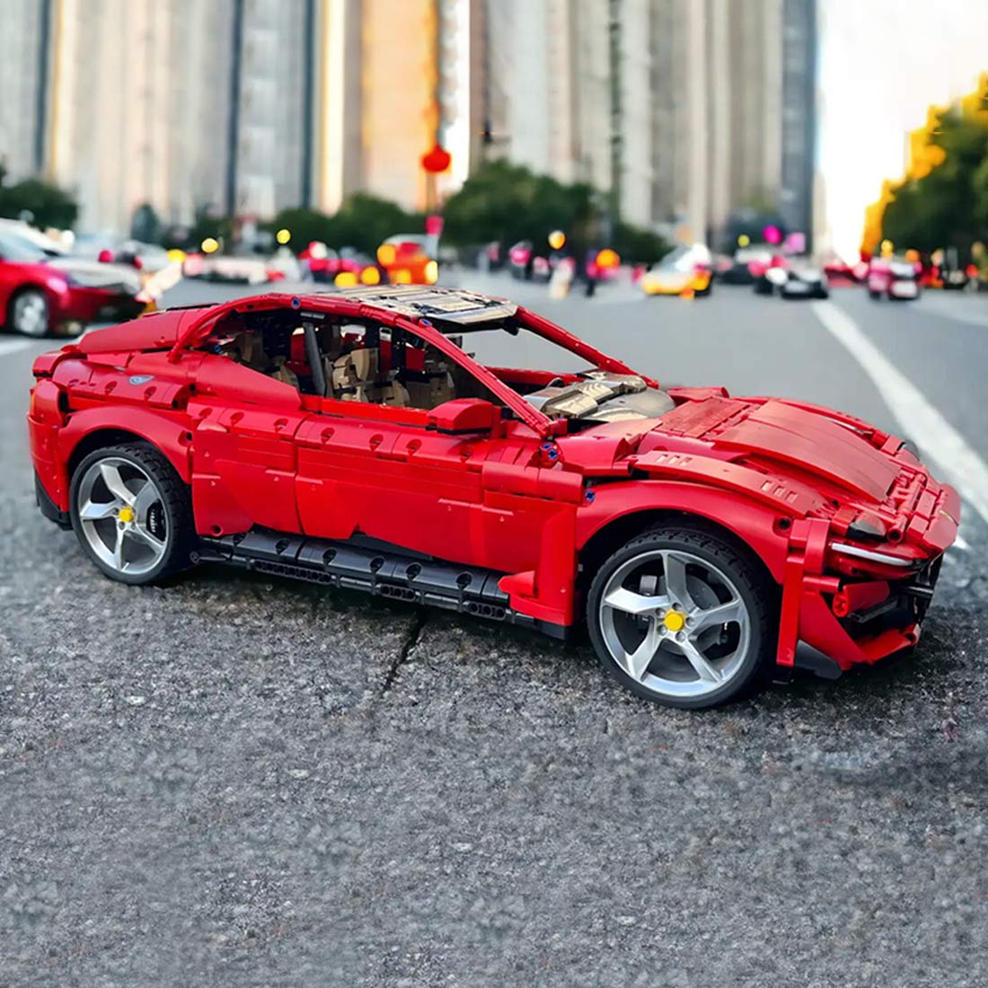 Entworfen und autorisiert von brictric. Dieses Bausteinauto ist einer bekannten Automarke nachempfunden und besticht durch sein leuchtendes Rot. Die schlanke und dynamische Karosserie spiegelt die Eleganz eines echten Sportwagens wider.