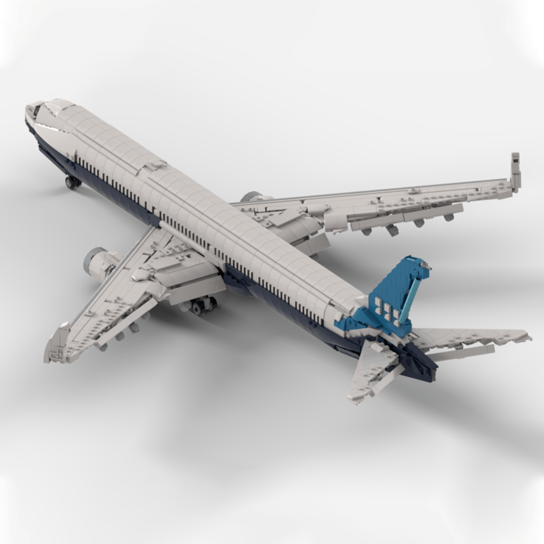 Die Klemmbausteine für zweimotorige Flugzeuge wurden von lryangc.productions entworfen. Dieses Modell basiert auf dem neuesten und größten Düsenflugzeug des renommierten Flugzeugherstellers, der 777X. Es ist detailgetreu restauriert und präsentiert perfekt seinen schlanken Rumpf, die leicht geneigten Tragflächen, die leistungsstarken Triebwerke und die stromlinienförmige Nase. Die Farbgebung ist in der klassischen Blau-Weiß-Kombination gehalten, und das auffällige Markenlogo am Heck verleiht dem Flugzeug sowohl technologisch als auch optisch eine beeindruckende Wirkung. Es ist außerdem mit ausfahrbarem Fahrwerk, Ruder, Landeklappen usw. ausgestattet und bietet hohen Spielspaß.