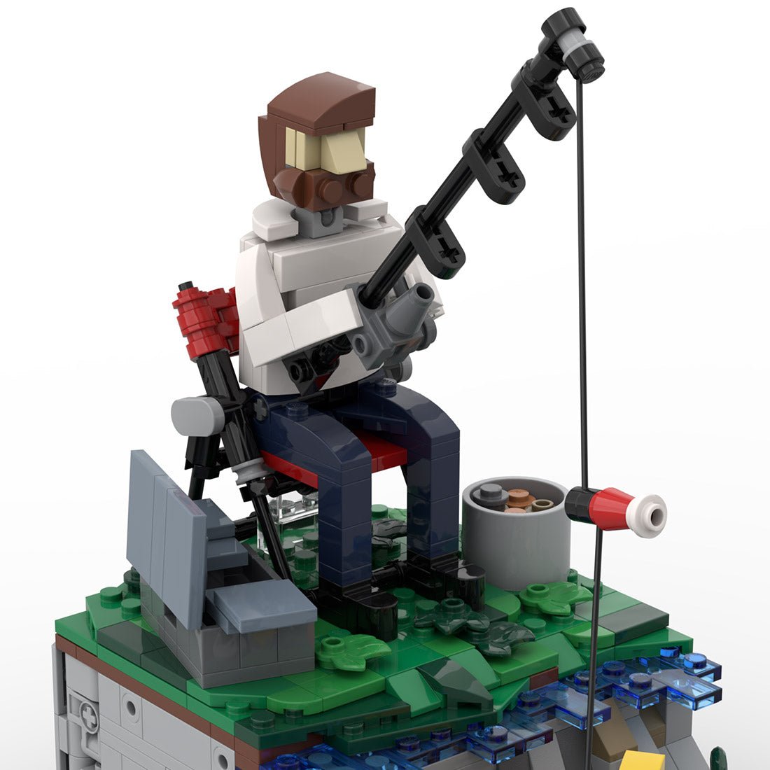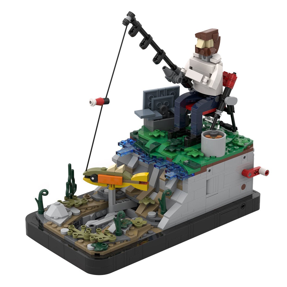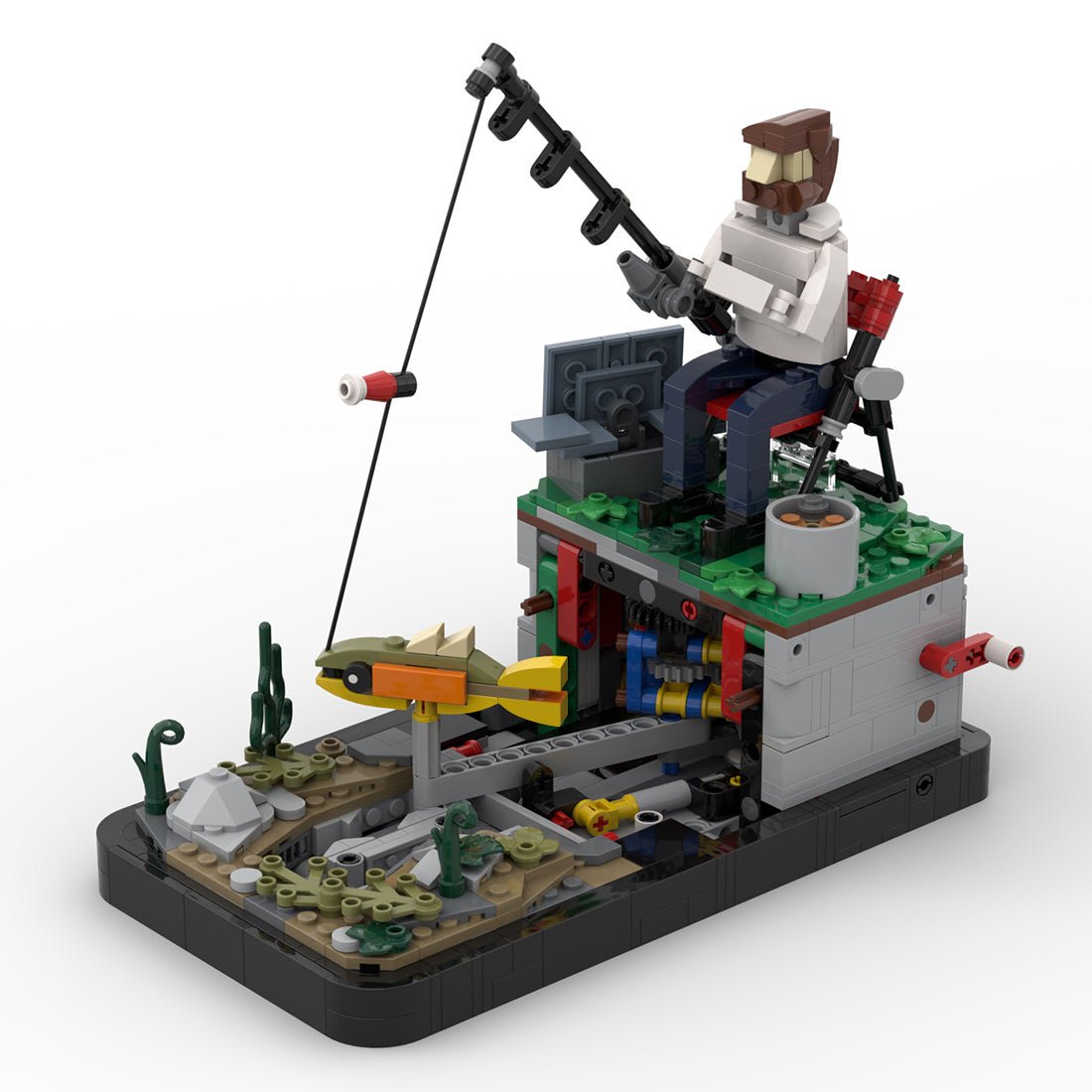 Dieses interaktive Angelmodell-Bausteinset wurde von ConstructionsByDonat entworfen und autorisiert und lässt Sie realistische Angelaction erleben. Wenn die Kurbel gedreht wird, bewegt sich der Fisch und simuliert so den Kampf zwischen Fisch und Angler. Ein kleines Gummistück unterstützt die Rückkehr des Fisches und ahmt natürliche Bewegungen nach – freies Schwimmen beim Entkommen und Aufrichten beim Einholen. Es enthält einen Motorerweiterungssteckplatz für ein Upgrade auf motorisierte, dynamische Bewegung.