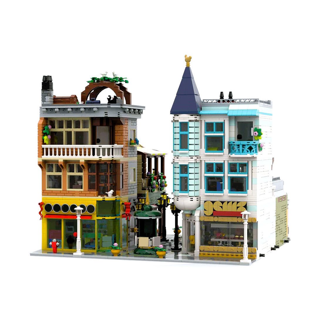 Dieses von Albox82 entworfene und autorisierte modulare Blockmodell der Altstadt umfasst vier einzigartige Geschäfte entlang einer detailreichen Kopfsteinpflasterstraße: einen Vintage-Zeitungskiosk, ein Juweliergeschäft mit höhlenartigem Interieur und vier Ausstellungsregalen, ein Blockgeschäft mit charakteristischen Backsteinwänden und abwechslungsreichen Regalen, ein Fahrradgeschäft und eine Pizzeria mit internem Badezimmer, Sitzgelegenheiten auf der Dachterrasse, Mini-Apartments und einem reizvollen Vordach für Grillabende und Blumen.