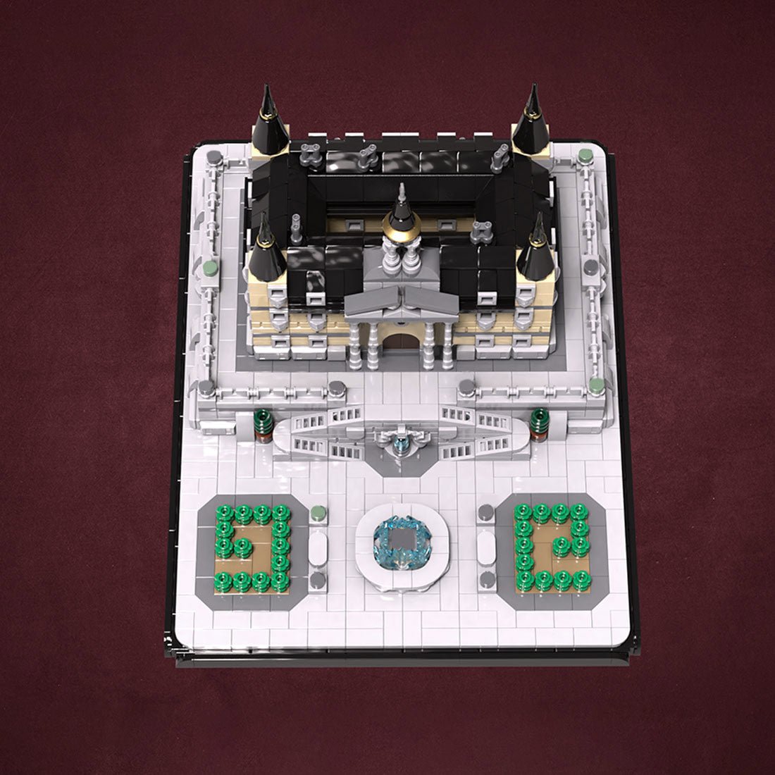 Entworfen von Corvus_Auriac. Dies ist ein wunderschönes Palastblockmodell im europäischen Stil. Das beigefarbene Hauptgebäude mit schwarzem Dach und emporragenden Türmen wirkt elegant und feierlich. Die graue Grundstruktur aus simuliertem Steinmauerwerk mit Kolonnaden und Bögen wirkt elegant und feierlich. Die Details sind exquisit und naturgetreu. Im Garten vor dem Schloss sorgen grüne Pflanzen und Springbrunnen für eine romantische Palastatmosphäre. Beim Zusammenbau können Sie Kreativität und praktischen Spaß voll ausleben. Das fertige Produkt kann als Dekoration verwendet werden und verleiht dem Raum künstlerischen Stil. Die stabile und inhaltsreiche Konstruktion eignet sich hervorragend als Dekoration für einen europäischen Palast.