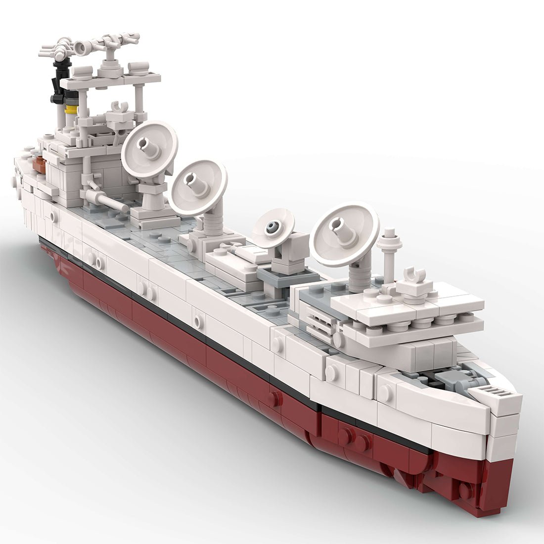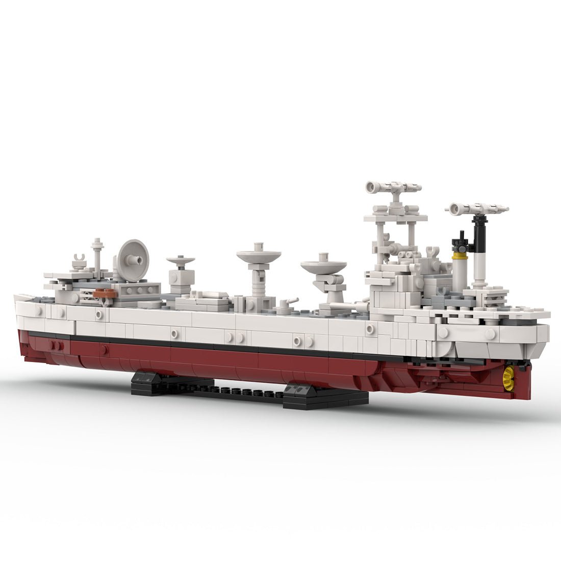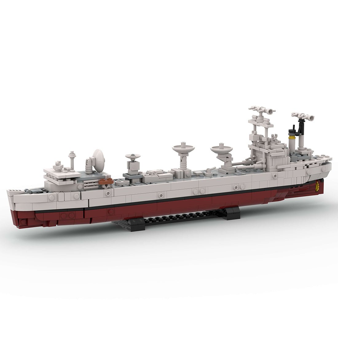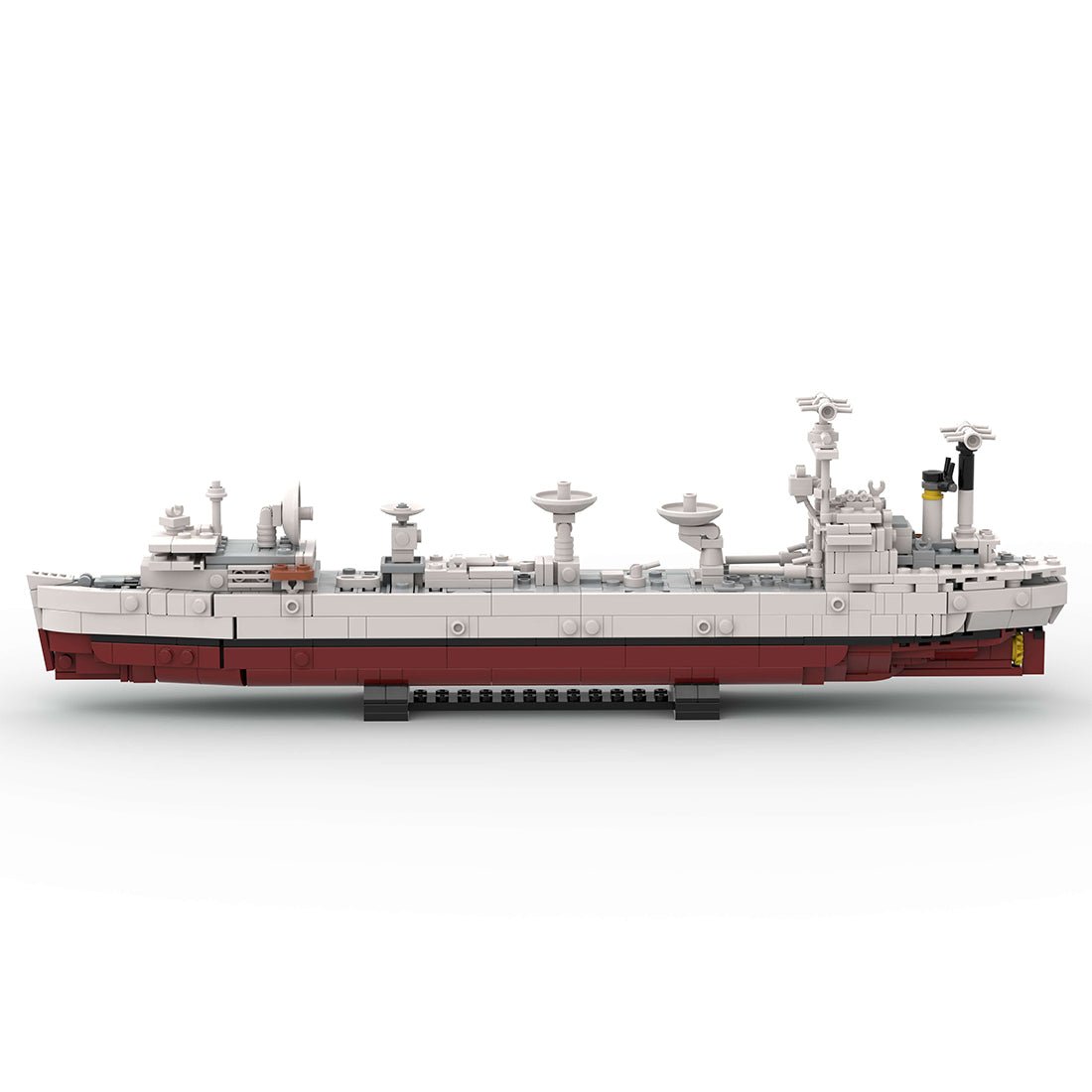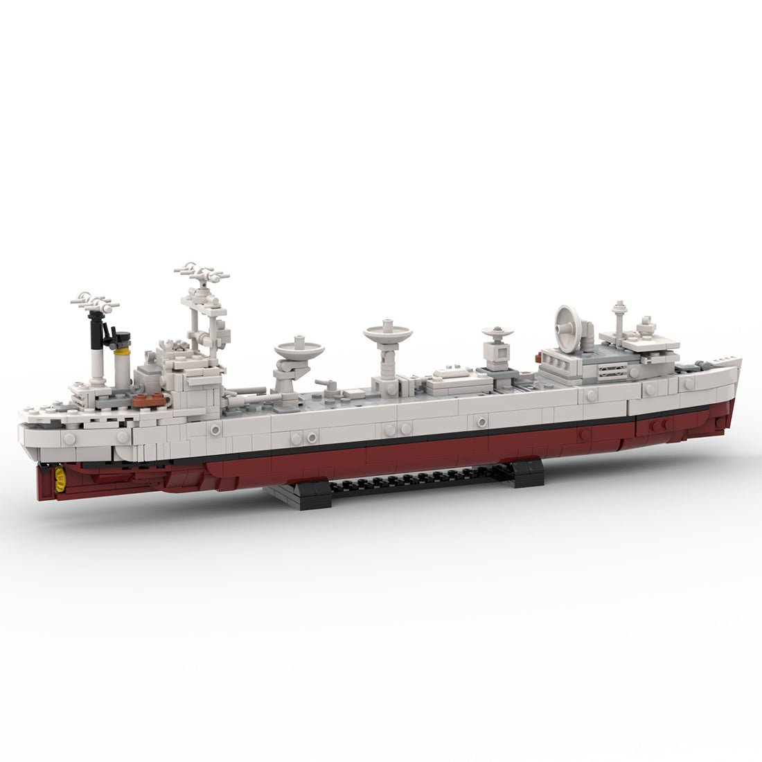 Detailed replica of the historic T2 tanker "San Fernando Mission," launched in 1943. During World War II, she served on various charters to transport fuel to Allied forces in the Pacific. In 1964, she underwent extensive modernization and remodeling, including an expansion and renaming first "Muscle Shoals" and later "Vanguard." Repurposed as a Missile Range Instrumentation Ship, playing a role in the Apollo and Skylab projects and the Apollo-Soyuz Test Project. Along with her sister ships, the USNS Mercury and USNS Redstone (both converted T2 tankers), she played a critical role in closely tracking and maintaining vital communications links. The USNS Mercury was later converted to a bulk carrier and renamed SS Kopaa, while the USNS Redstone was scrapped on January 30, 1995. The USNS Vanguard was decommissioned in 1999 and transferred to the United States Maritime Administration and finally scrapped in 2013 in Brownsville, Texas.