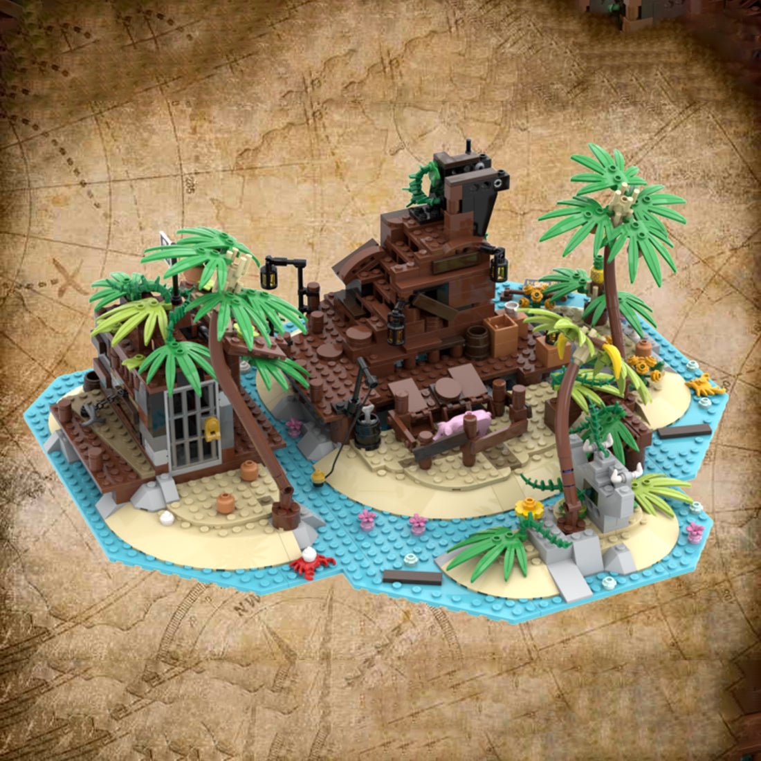 - From the Designer: The model was originally designed and licensed by Lord Tony. After several months of staring at my unused Barracuda island because I didn't want to take the ship apart, I decided to build my own island(s). I tried to use all the pieces, which unfortunately I could. The island got too narrow and it would look messy so there are several unused parts but there is a lot of detail with the small number of parts I used. I created 4 islands that you can mix/match and rearrange as you like. Which combination of islands you want is entirely up to you. There is a prison island, a farm/main island, a tiki head island and a fruit island. There are 2 coconut trees, 1 banana tree and 1 pineapple tree. The prison cell has a removable wall for easy escapes. There's even a working rope/pulley you can use to lift a shark out of the water!