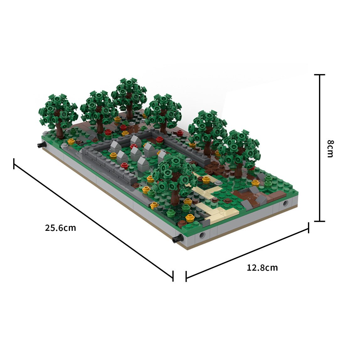 Entworfen und autorisiert von Alessandro Maffioli. Dies ist eines der Miniatur-Militär-Sandbox-Szenenmodule mit dichten grünen Bäumen, dazwischen bunten Blumen, grauen Grabsteinen und Steinmauern für eine stimmungsvolle Atmosphäre sowie Wegen, die die Szenerie verbinden. Spieler können selbst einen ruhigen und geheimnisvollen Waldfriedhof errichten und beim Zusammenbau in die Gestaltung einzigartiger Szenen eintauchen. Es bietet nicht nur ein interessantes Baustein-Erlebnis, sondern auch eine einzigartige Miniatur-Landschaftsdarstellung, die Spieler mit dem Wunsch, ruhige Szenen zu gestalten, zufriedenstellt und ein kleines Abenteuer der „Landschaftsgestaltung“ mit nur einem Fingertipp startet.