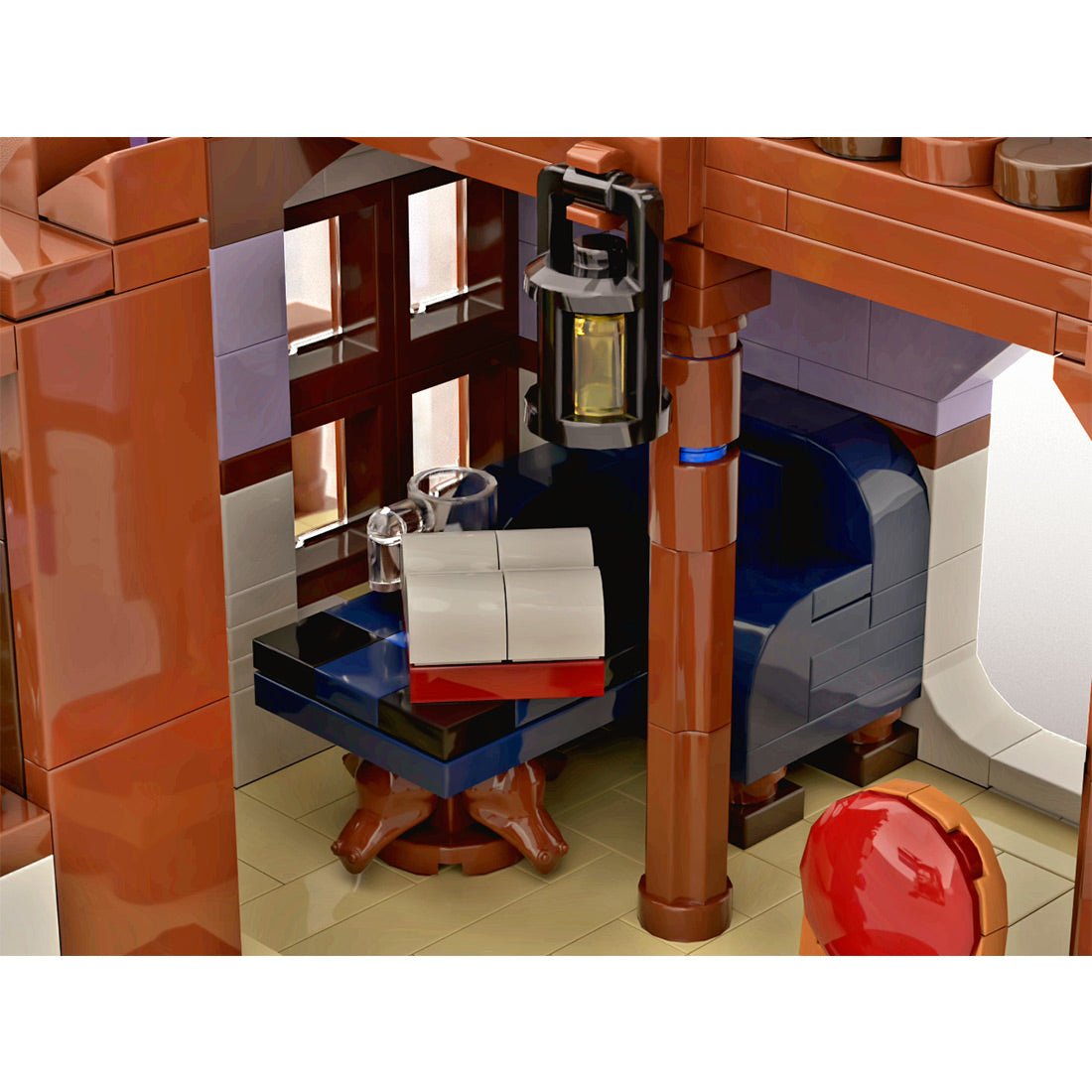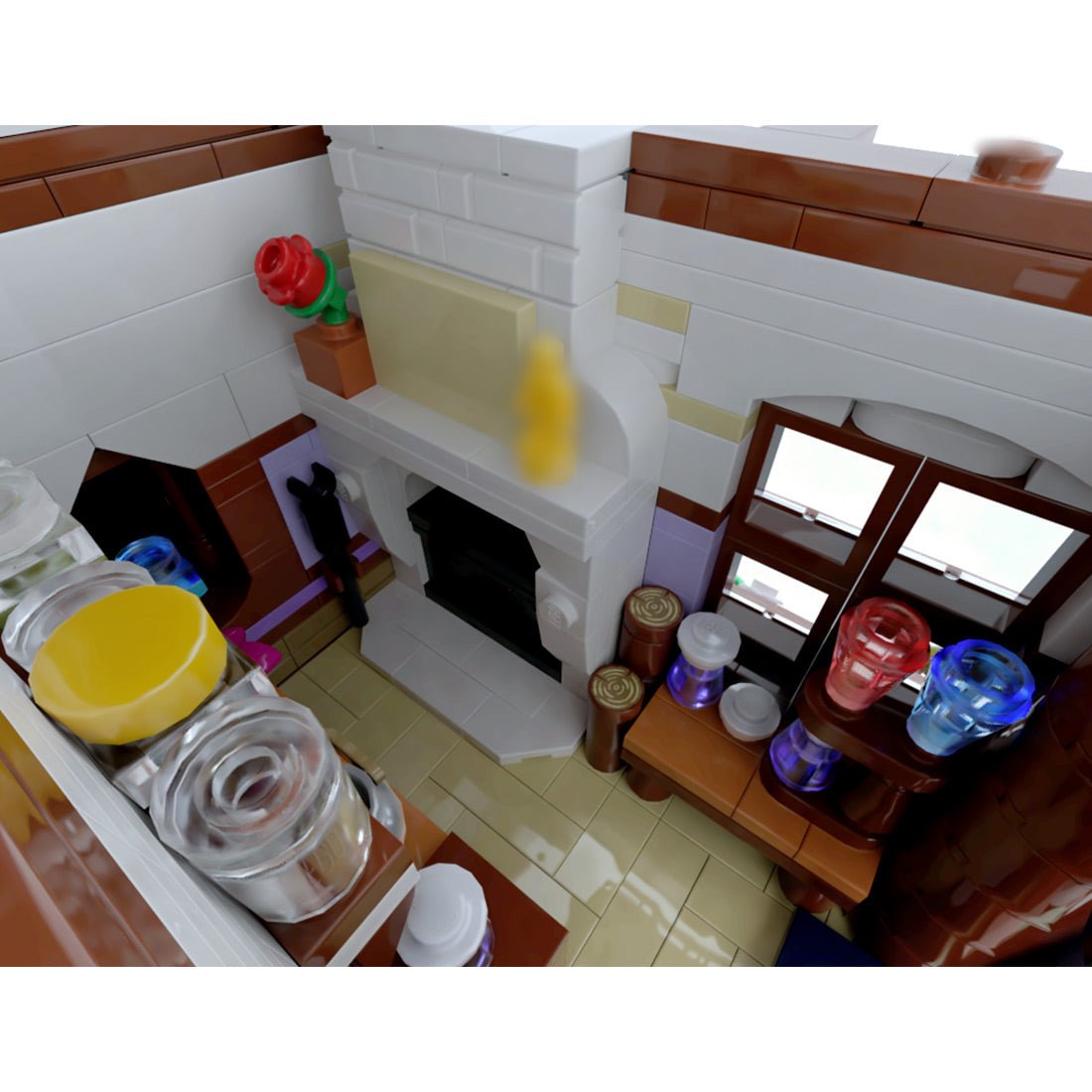 - This set, designed and authorized by TRISHULA, contains a magical potion house built from building bricks. It consists of six modules: entrance, main hall, fireplace, stairs to the second floor and potion room. The second part consists of a bed, bookshelves, two tables, a sofa and windows. The third module contains the main hall section with a statue of Grimro. Another main hall section with brightly colored glass is included in the fourth part. The fifth and sixth sections form the roof. With rich details, including an organ in the fireplace, a Potions room in bed, a table on the sofa, bookshelves, corner windows and a crying woman statue with black wings, red heels and white skin inspired by the Grimro map. The design includes intricate interiors and large assembled glass elements.