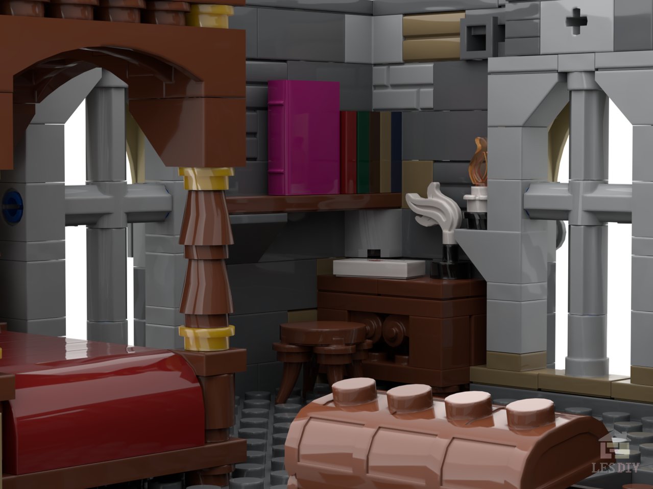 - The interiors are spacious and have some basic furniture and accessories, including tables, chairs, beds and fireplaces. A fireplace is equipped with red light bricks. I did not include floor tiles and advanced decorations to keep the medieval blacksmith style and costs in check.
