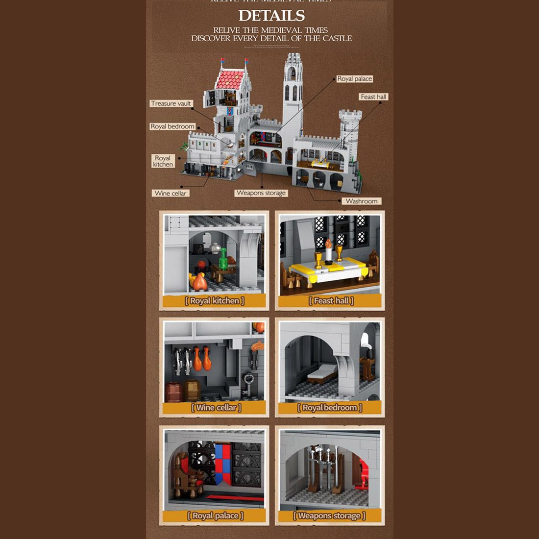 Es ist mit zwei Hauptansichten gestaltet – Vorder- und Rückseite. Spieler können die Außenseite des Schlosses nachbauen oder es aufklappen, um das detailreiche Innere zu erkunden. Im Inneren befinden sich mehrere Funktionsbereiche, darunter ein Thronsaal, ein Gefängnis, ein Wachturm, eine Zugbrücke und Geheimtüren. Durch die Interaktion mit Charakteren und Szenen können Spieler Schlachten um die Burgverteidigung, das königliche Leben und weitere spannende Geschichten erleben.