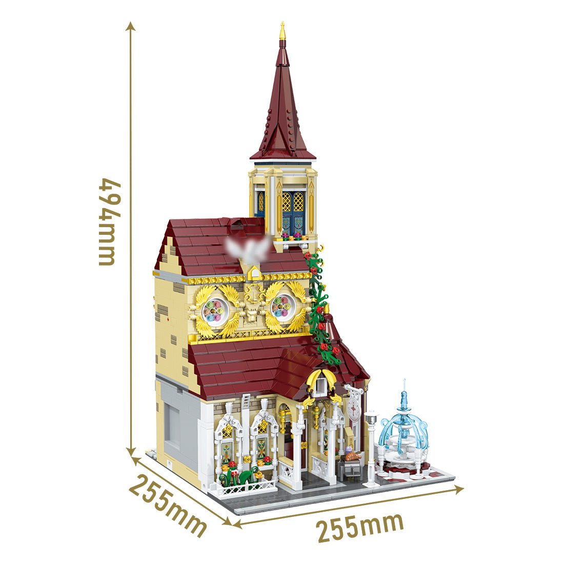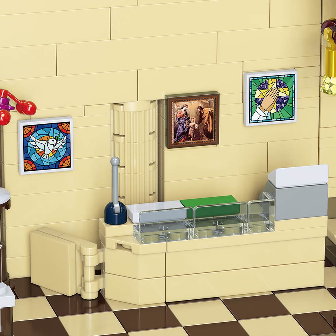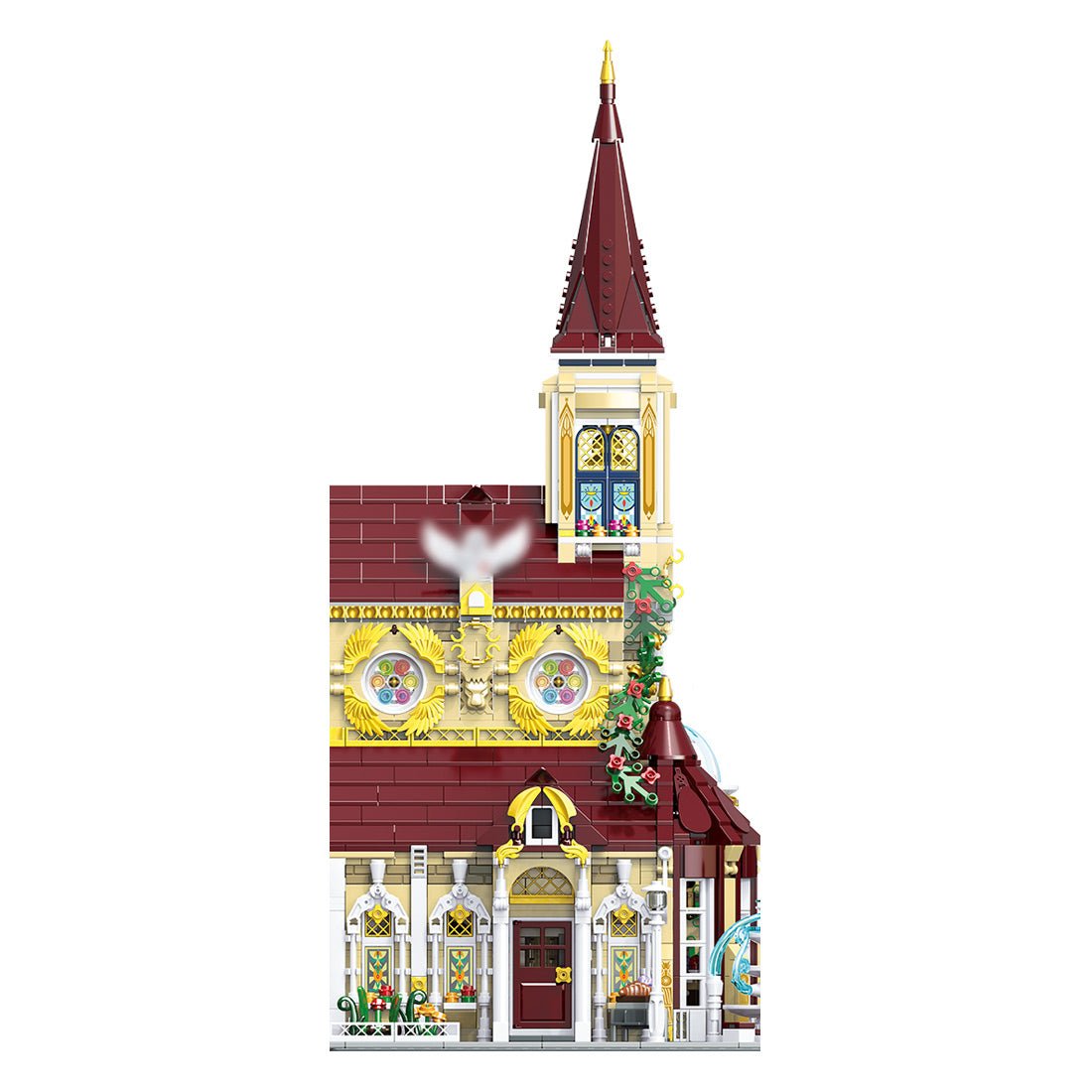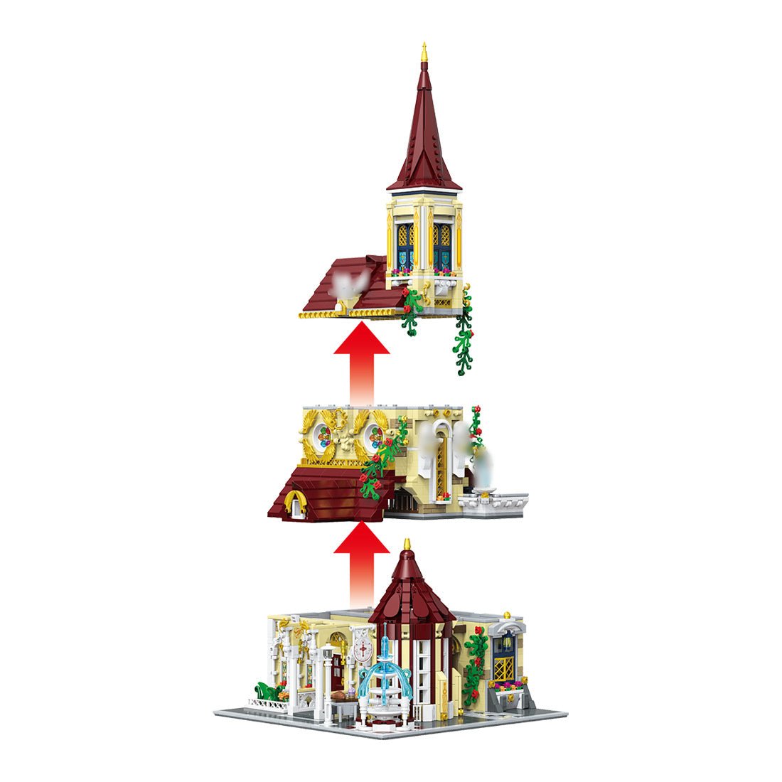 Dieses Bauset im Stil einer Abtei besticht durch ein komplexes Design mit detaillierten Wandreliefs und Mustern, die komplexe architektonische Elemente einfangen. Mit seinem hohen Kirchturm und der markanten Turmspitze strahlt das Modell ein Gefühl historischer religiöser Kunstfertigkeit aus und ähnelt stark den Ausmaßen und der Atmosphäre eines echten Klosters. Das tiefrote und elfenbeinfarbene Farbschema mit Goldakzenten verleiht dem Ganzen Eleganz und Raffinesse, während die Rosettenfenster aus Buntglas an der Vorderwand einen Hauch zeitlosen Charmes verleihen.