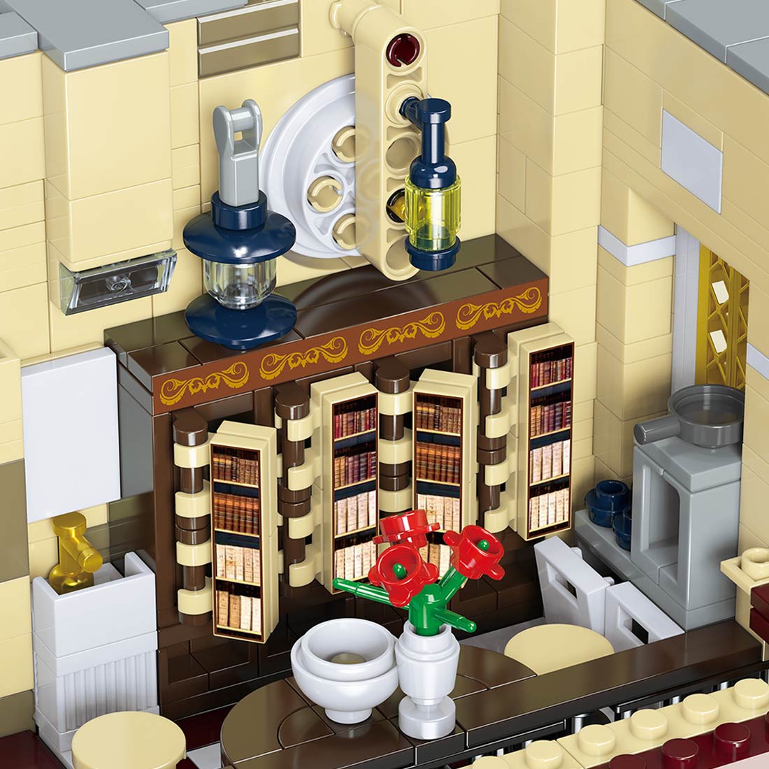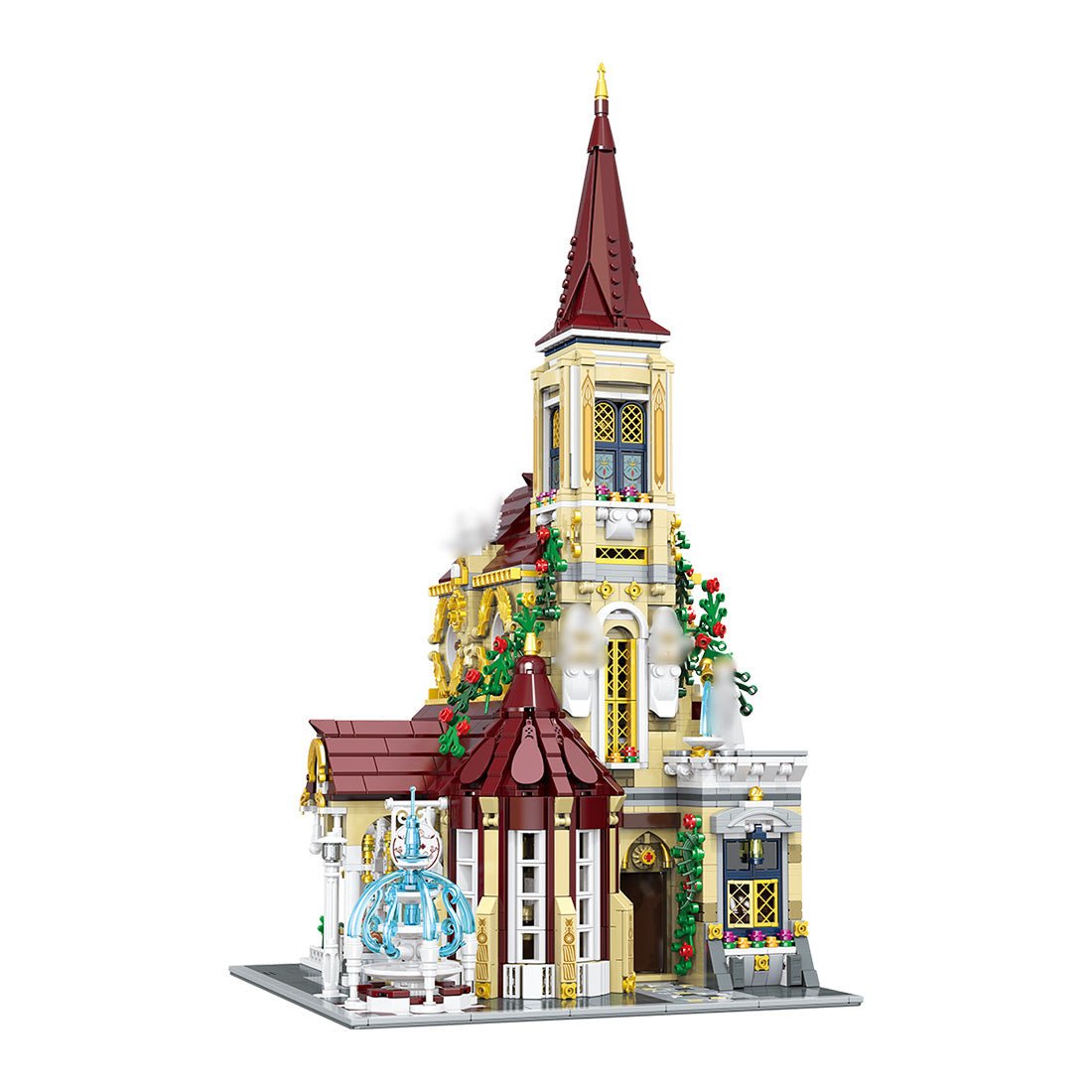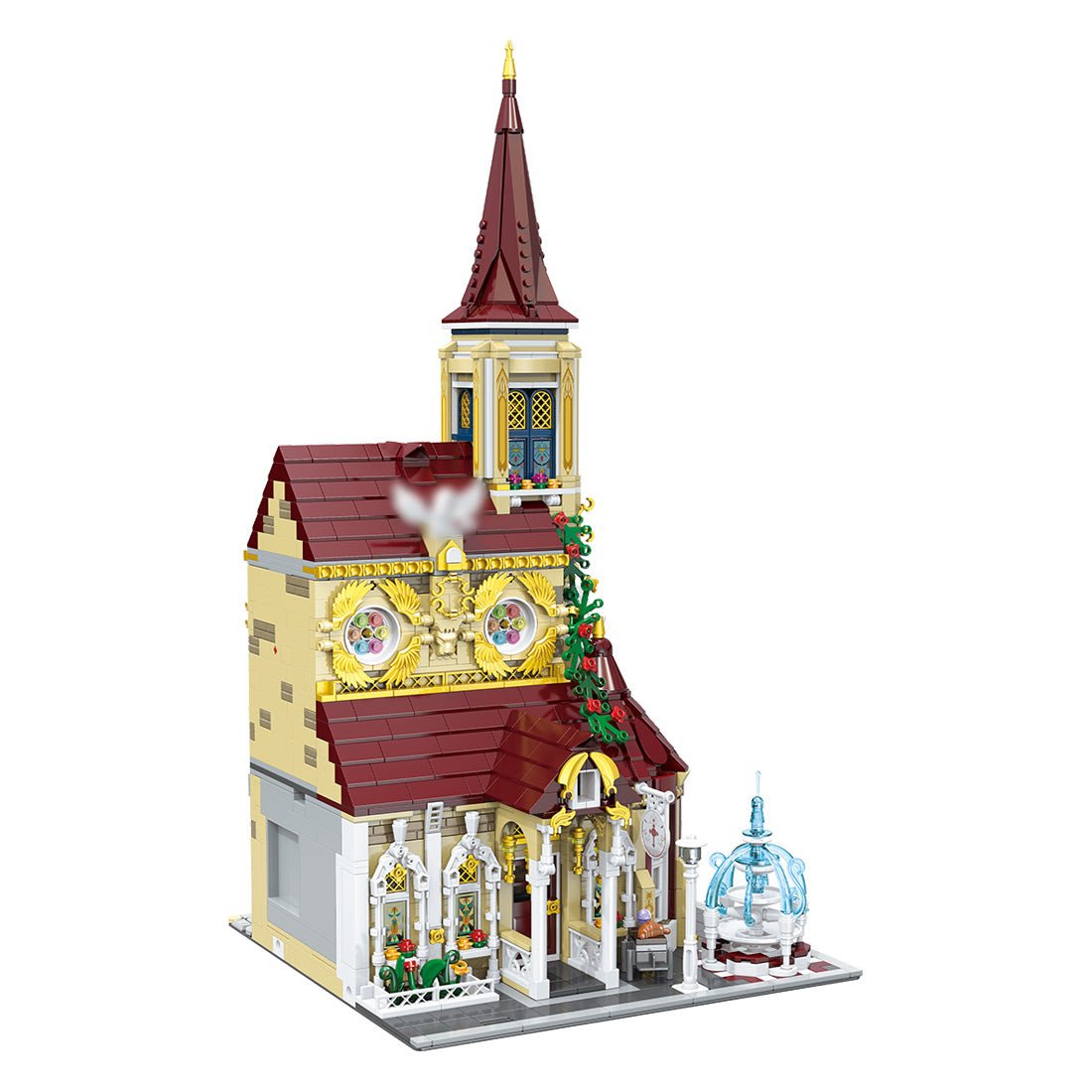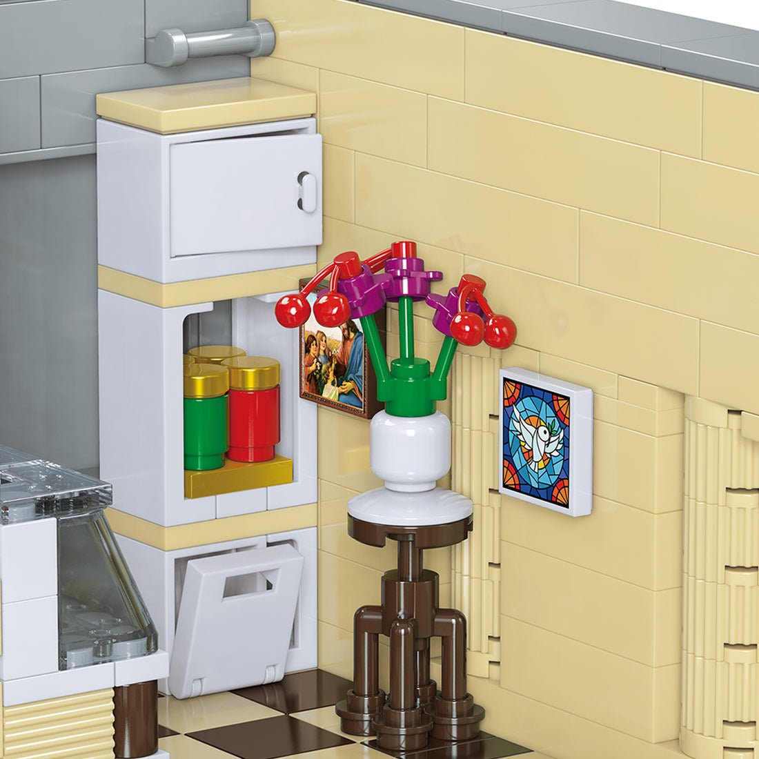 Dieses Bauset im Stil einer Abtei besticht durch ein komplexes Design mit detaillierten Wandreliefs und Mustern, die komplexe architektonische Elemente einfangen. Mit seinem hohen Kirchturm und der markanten Turmspitze strahlt das Modell ein Gefühl historischer religiöser Kunstfertigkeit aus und ähnelt stark den Ausmaßen und der Atmosphäre eines echten Klosters. Das tiefrote und elfenbeinfarbene Farbschema mit Goldakzenten verleiht dem Ganzen Eleganz und Raffinesse, während die Rosettenfenster aus Buntglas an der Vorderwand einen Hauch zeitlosen Charmes verleihen.