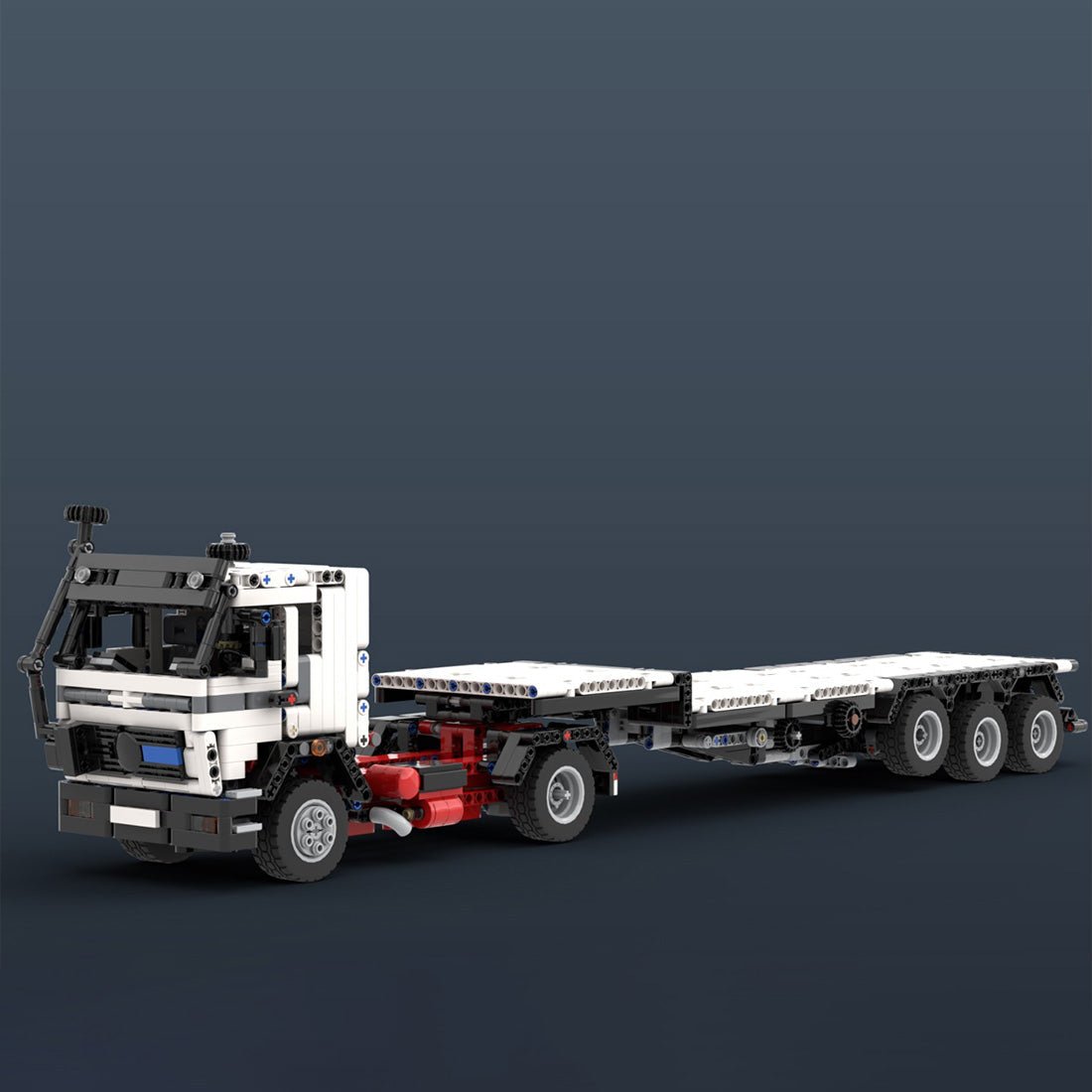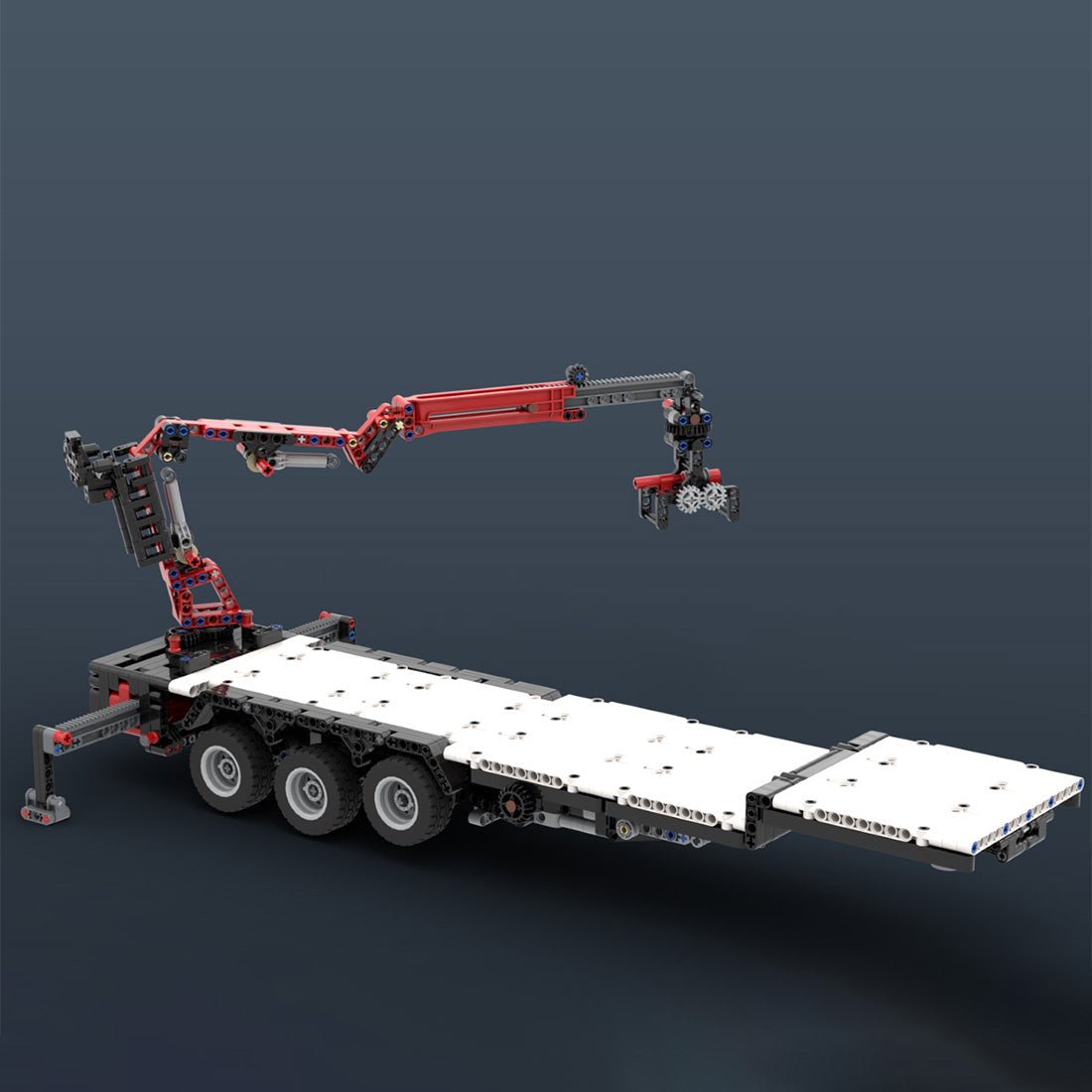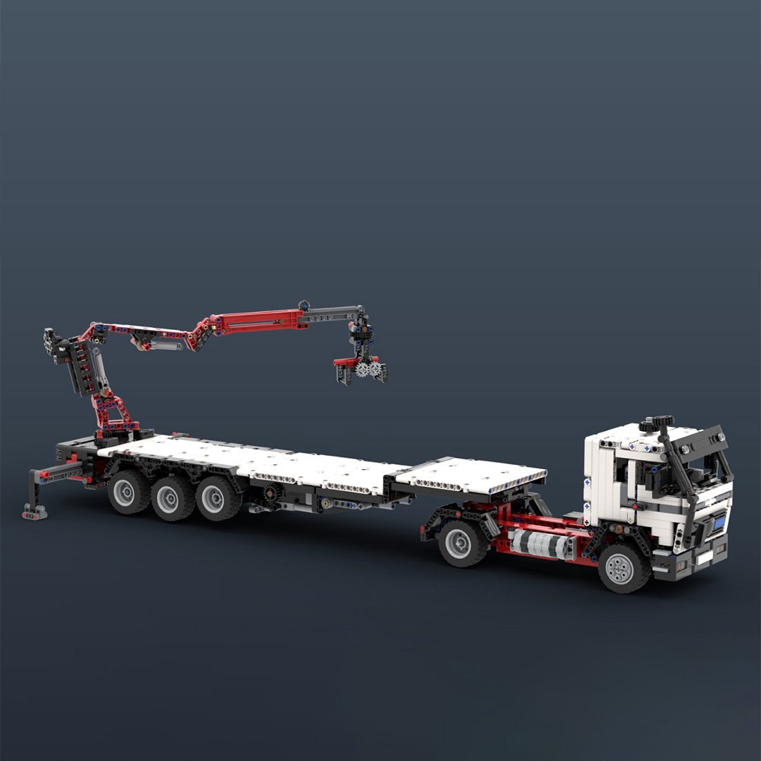 - This is a Mercedes NG in a 2-axle cab configuration with a low loader equipped with a removable “Z” type crane. This truck has steering, a working V8 engine with a rotating fan, and a fifth wheel for the trailer. The cab can be tilted, it has a working steering wheel and opening doors. A 3-axle low loader is included, it has a liftable axle and stabilizers. The crane has a special Z design, the supports are extended individually by hand and the 2 sections are controlled by 2 linear drives. The boom is extendable and the claw attachment can rotate and clamp objects, the crane is rotated by hand. The crane can then be removed and attached in just a few steps.