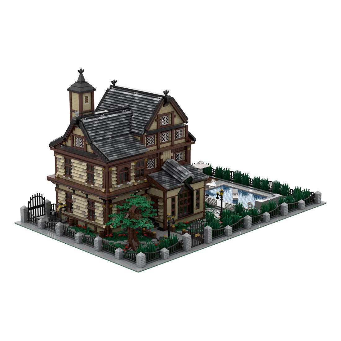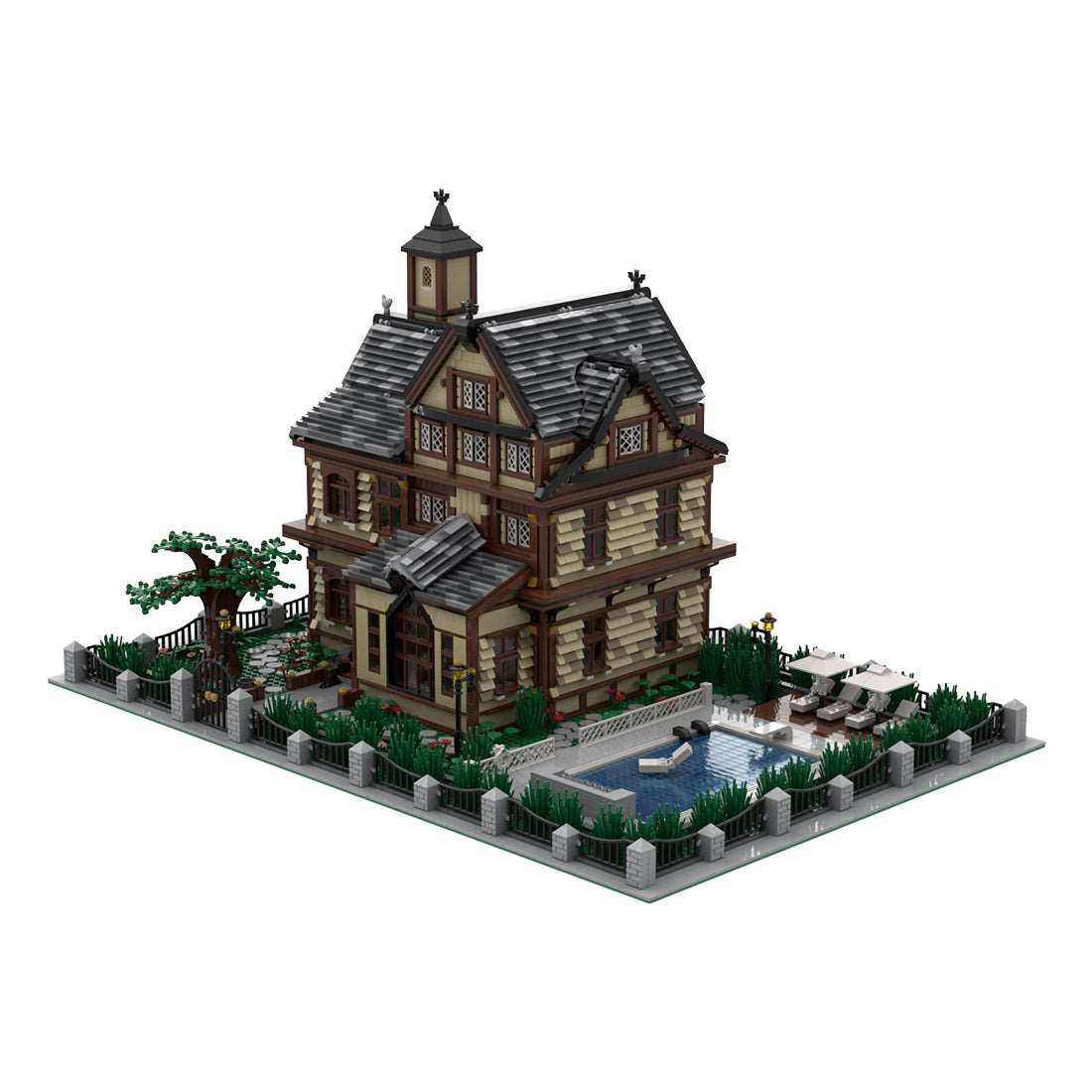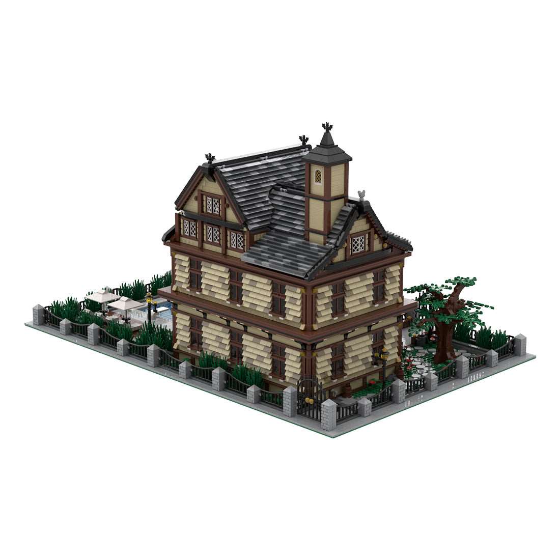 The roof takes advantage of the sloped design and uses many parts to combine it.