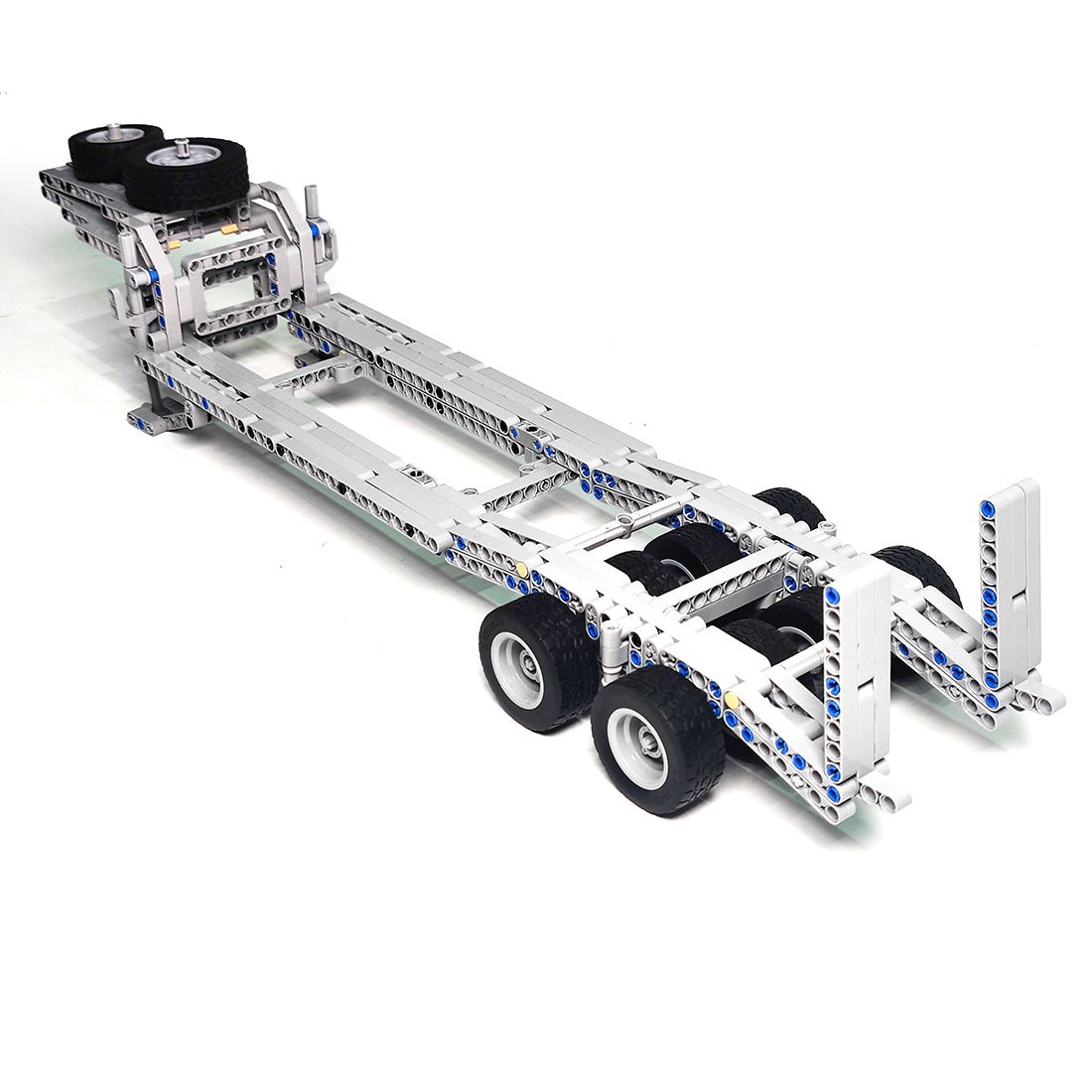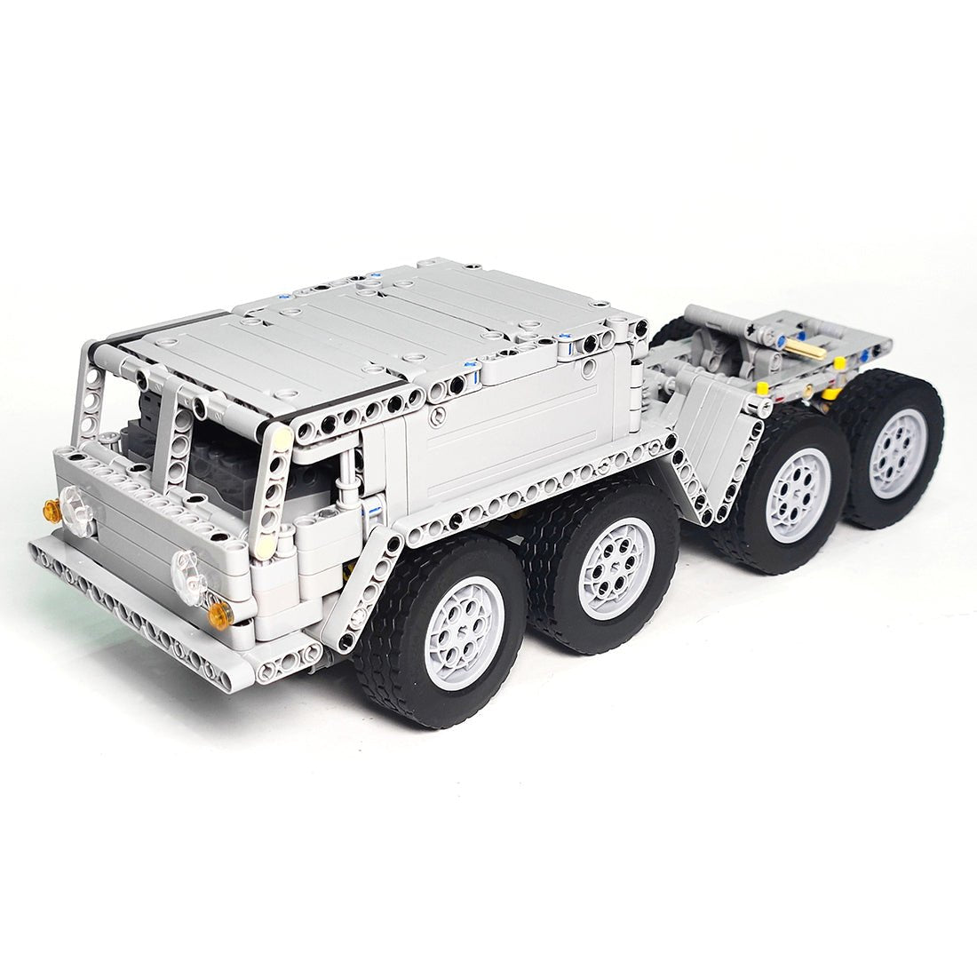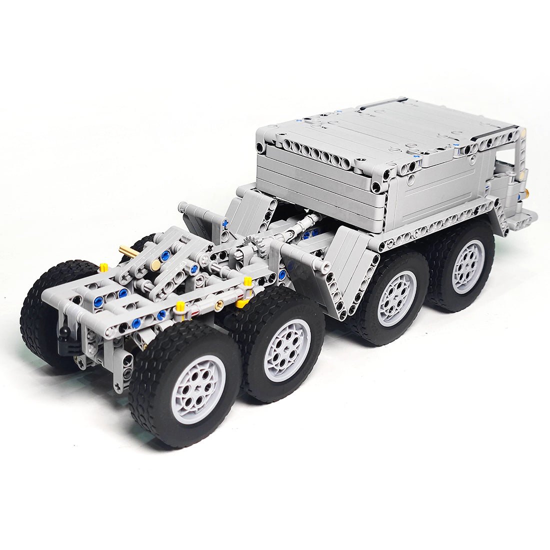 - The product includes the front end and body powered by two PF-L motors and controlled by a PF servo, and features independent front suspension with rubber bands, walking beam suspension at the rear, tilting fifth wheel with lock and opening doors.