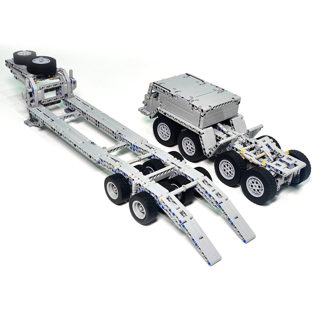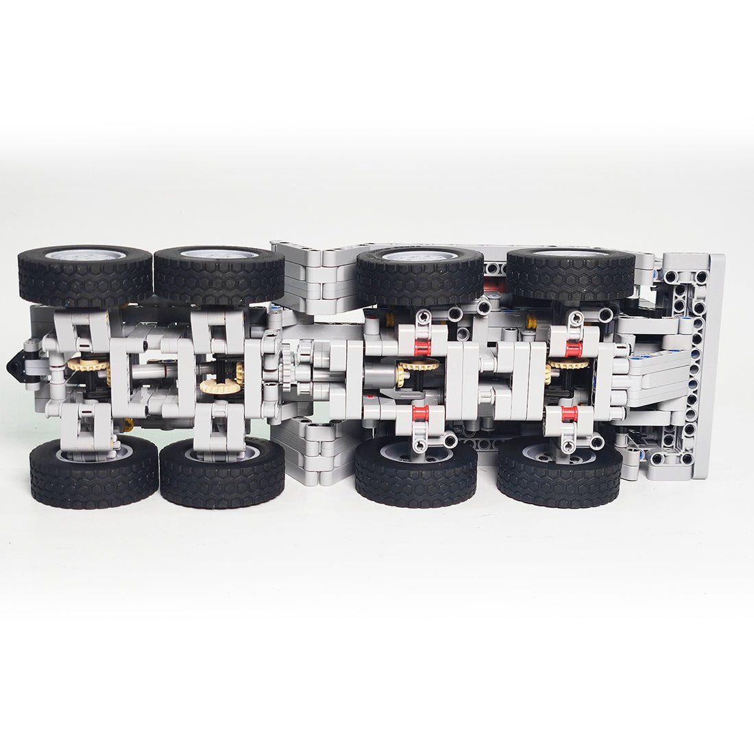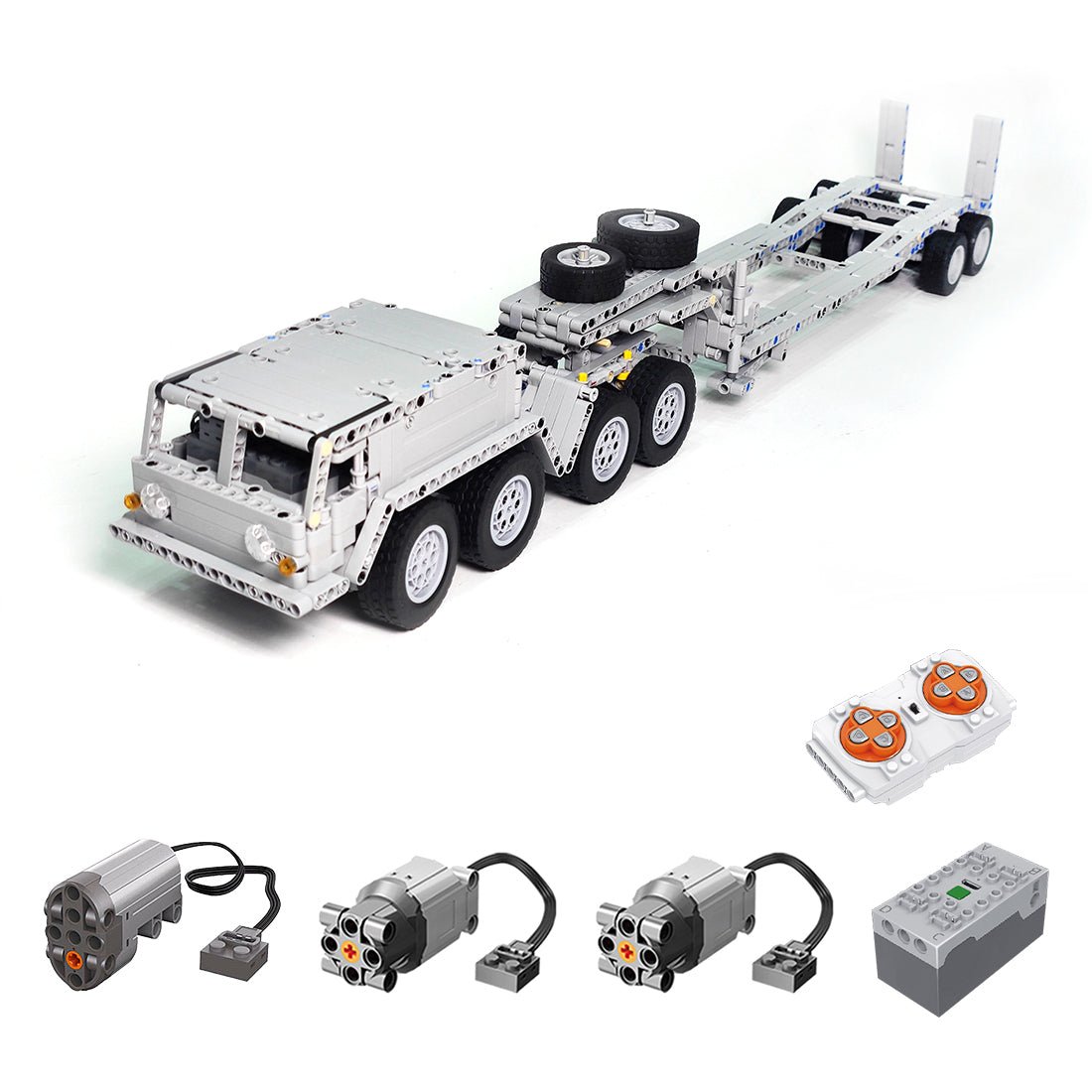- The product includes the front end and body powered by two PF-L motors and controlled by a PF servo, and features independent front suspension with rubber bands, walking beam suspension at the rear, tilting fifth wheel with lock and opening doors.