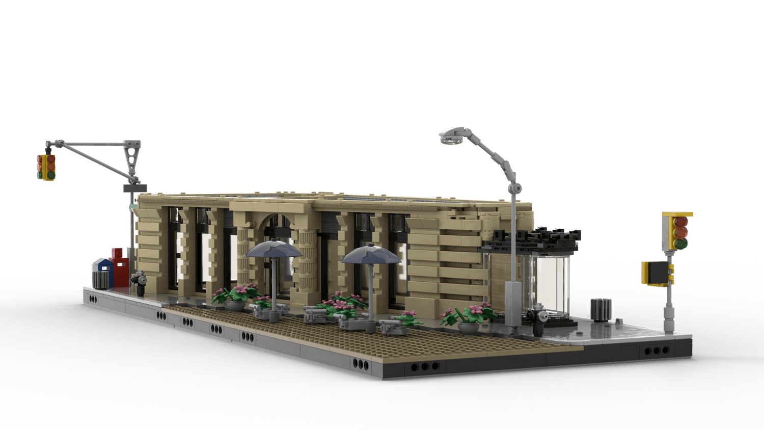 Street-level realism: traffic lights, cafe seating, newsstand, and plantings.