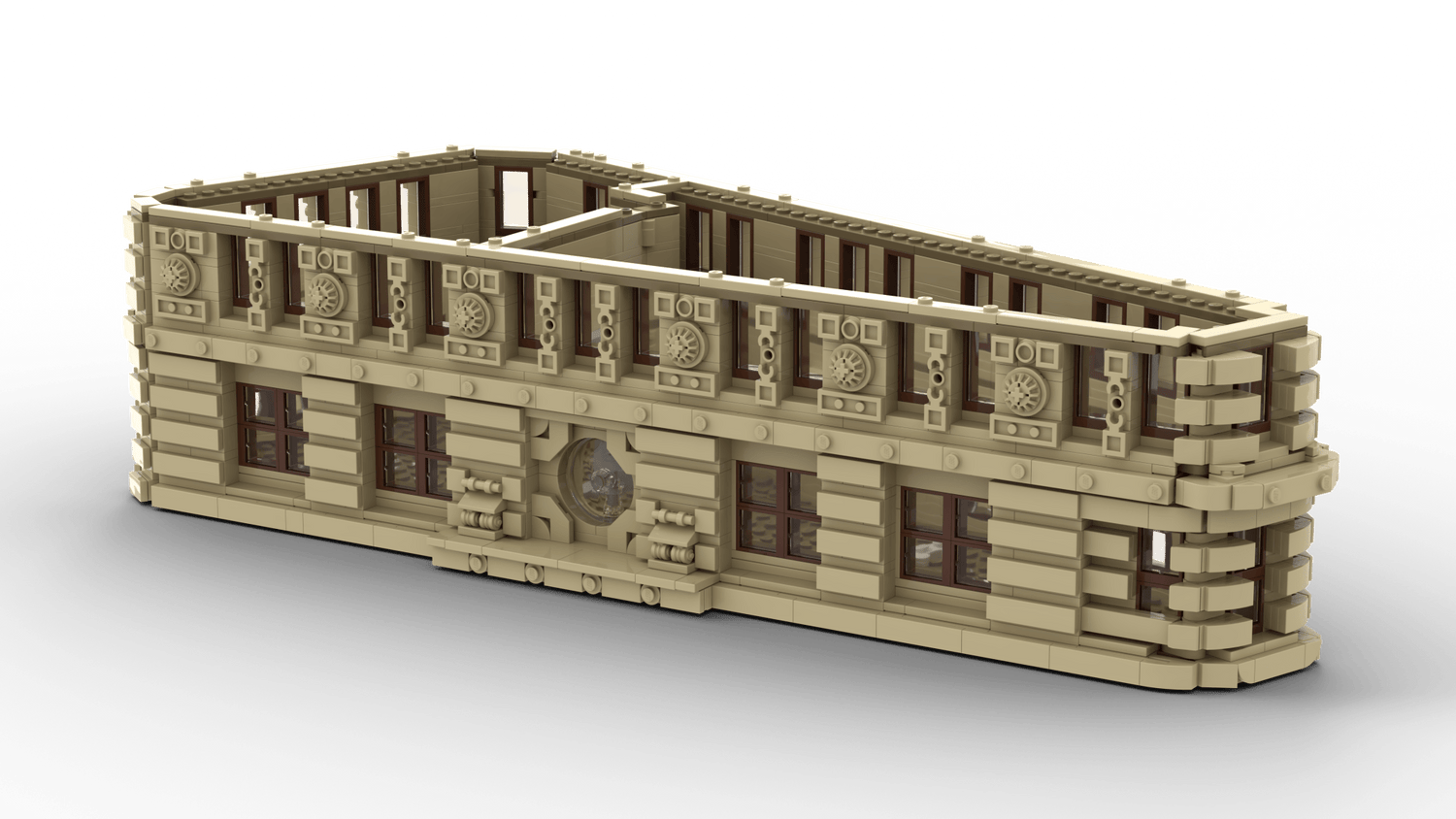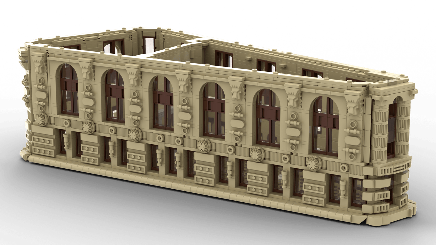 Arched windows, decorative cornice, and tan brickwork.