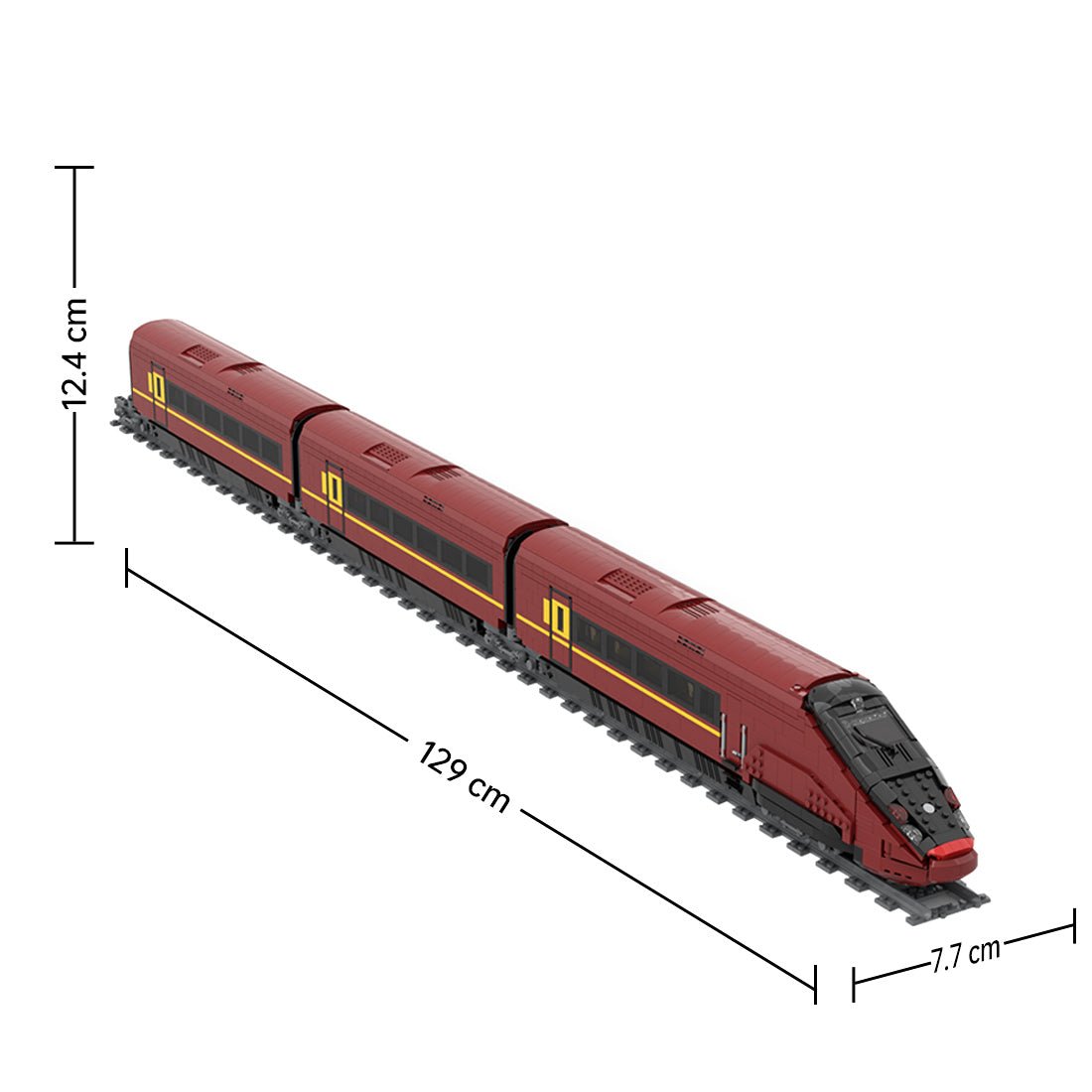 Entworfen und autorisiert von Gabriele. Basierend auf der Club Executive Class des Hochgeschwindigkeitszuges AGV-575. Das gesamte Produkt gibt das purpurrote, stromlinienförmige Erscheinungsbild des Hochgeschwindigkeitszuges originalgetreu wieder, der in 11 Waggons und vier Teile unterteilt werden kann. Dies ist das Modell C1 C2 C3 – die erste Economy-Klasse ist die „Club Executive Class“, die zweite und dritte Economy-Klasse sind die „Prima Business Class“. Es kann frei ausgewählt und mit anderen Teilen kombiniert werden, um einen kompletten AVG-575-Zug zu bilden.